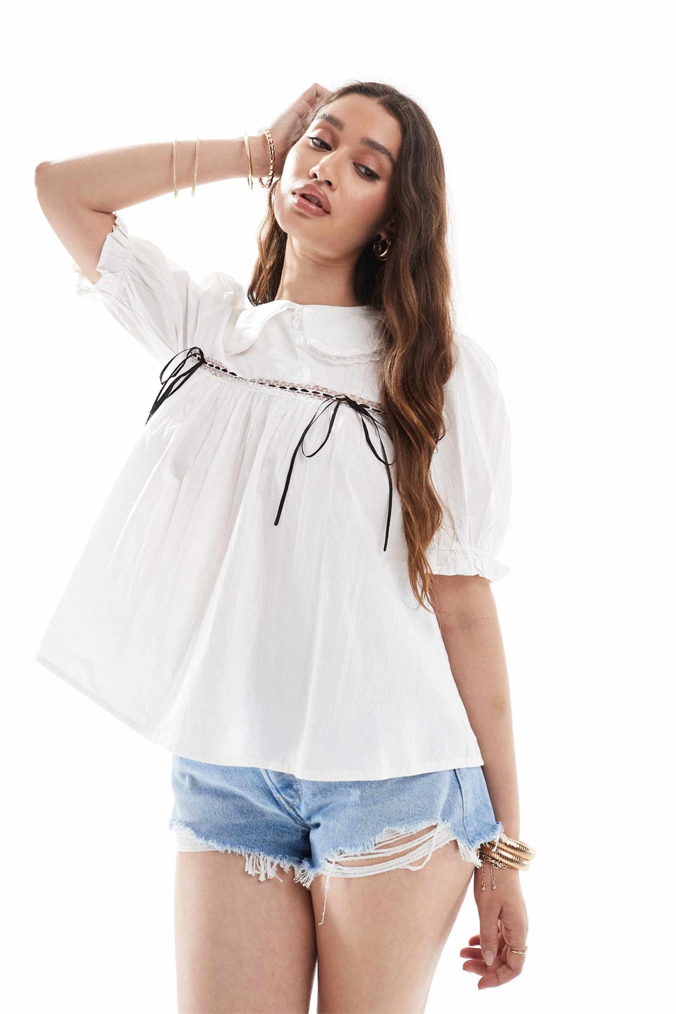Блузка с коротким рукавом и декором на воротнике, с вставкой из ленты