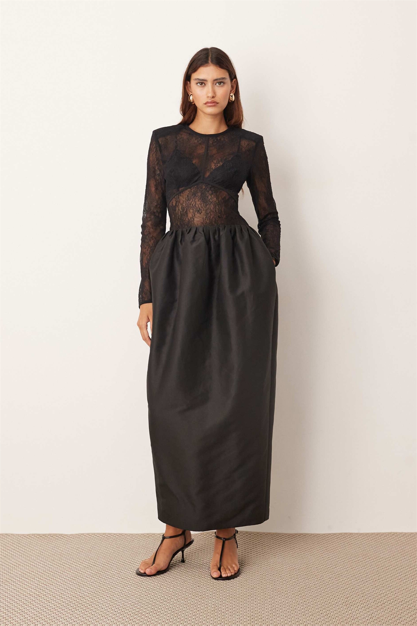 Макси-платье с длинными рукавами из кружева и ламинированного атласа