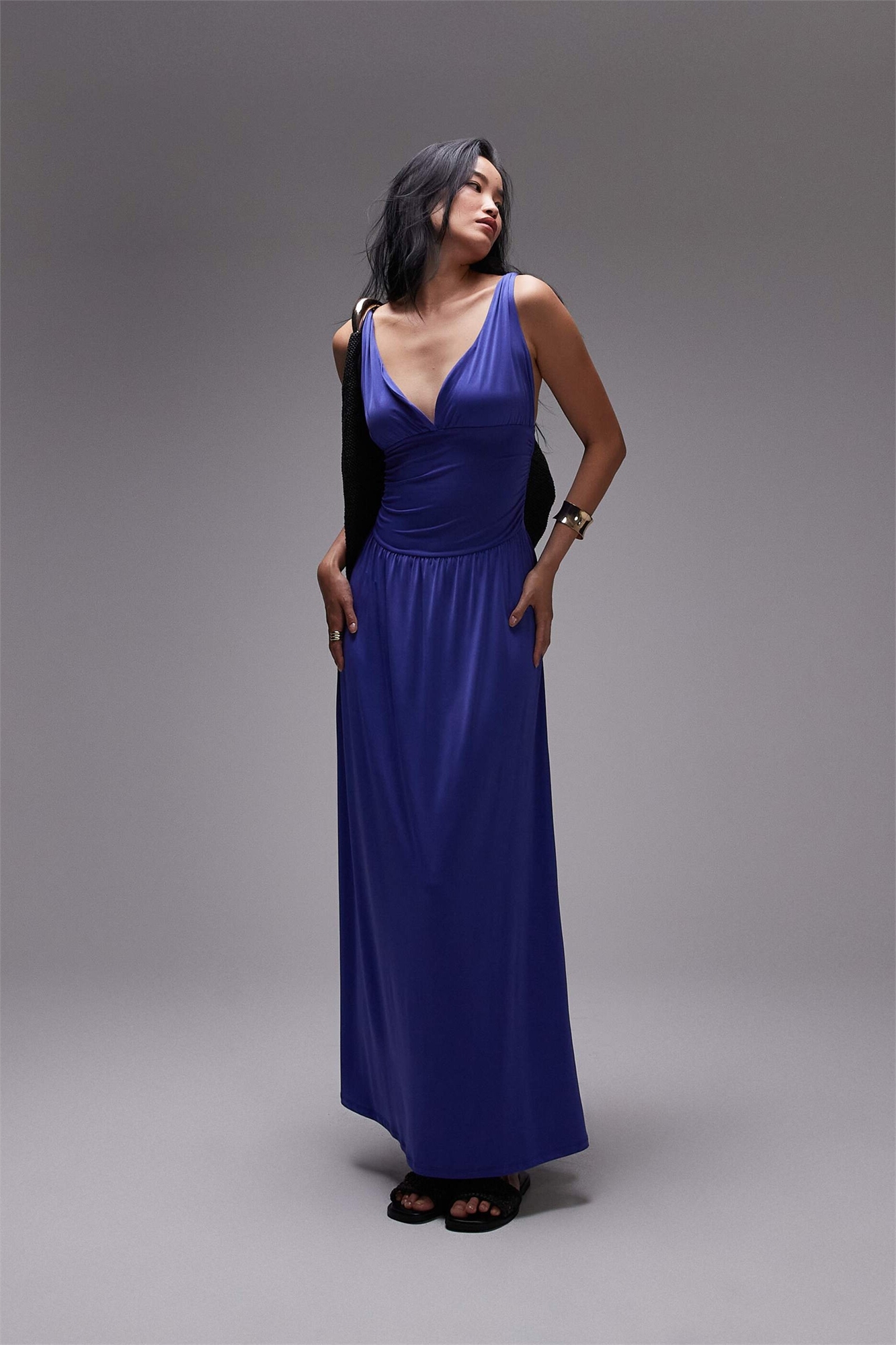 Макси-платье с бретелями и рюшами на талии