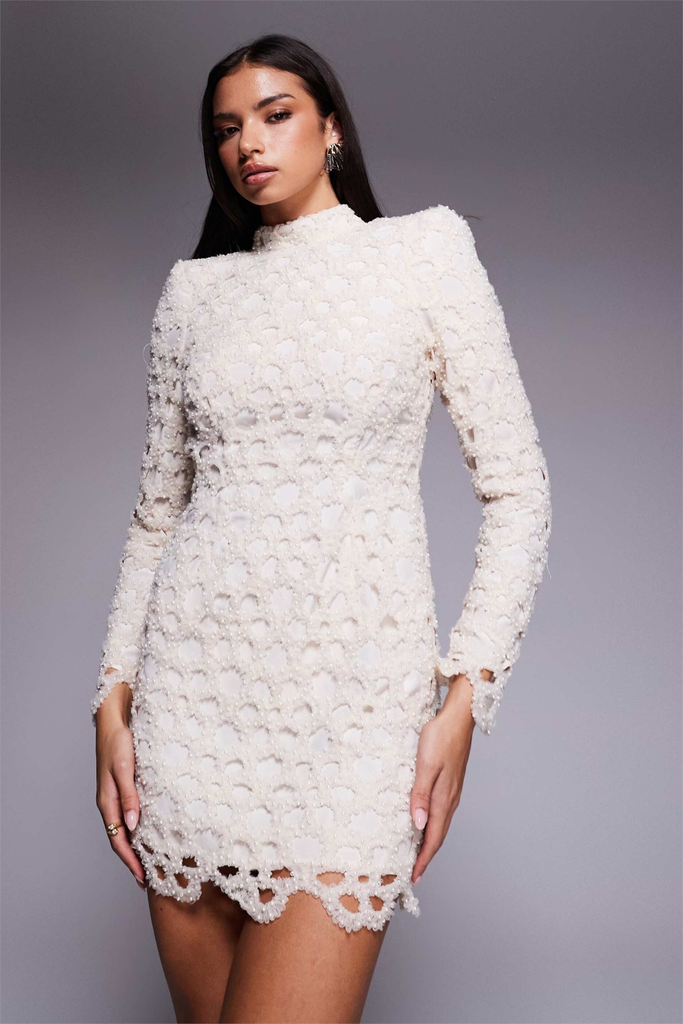 Мини-платье с высоким воротником, украшенное жемчугом и выполненное в технике лазерной резки