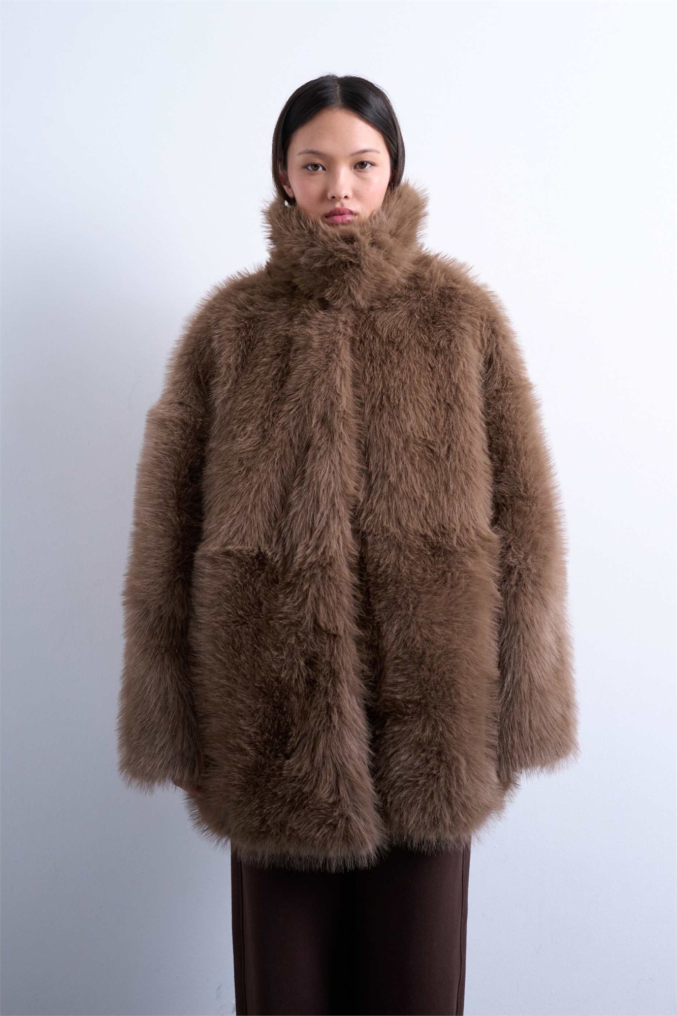 Пальто средней длины с воротником-воронкой из искусственного меха
