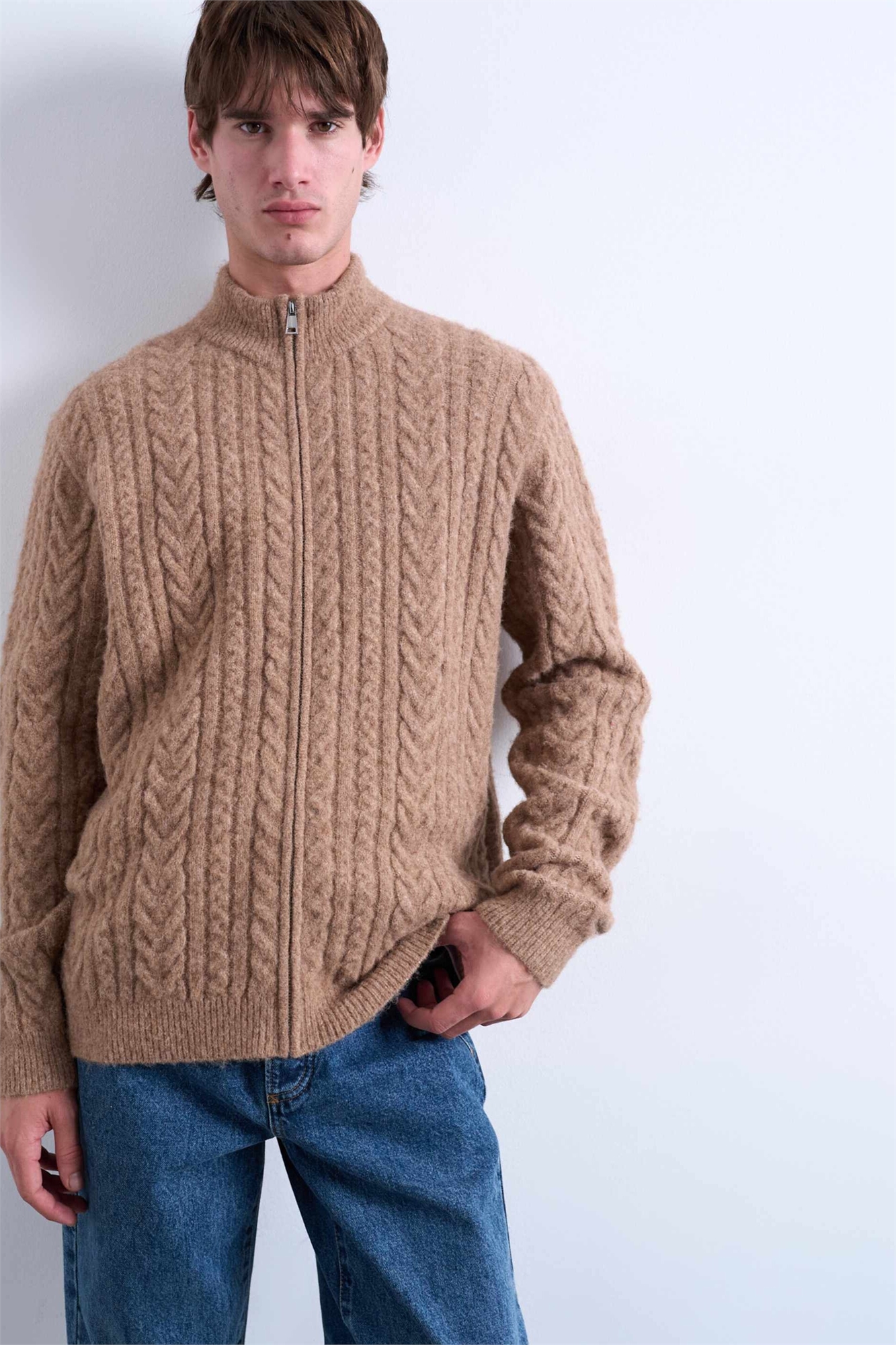 Кардиган с воротником-воронкой, связанный из пряжи, на молнии