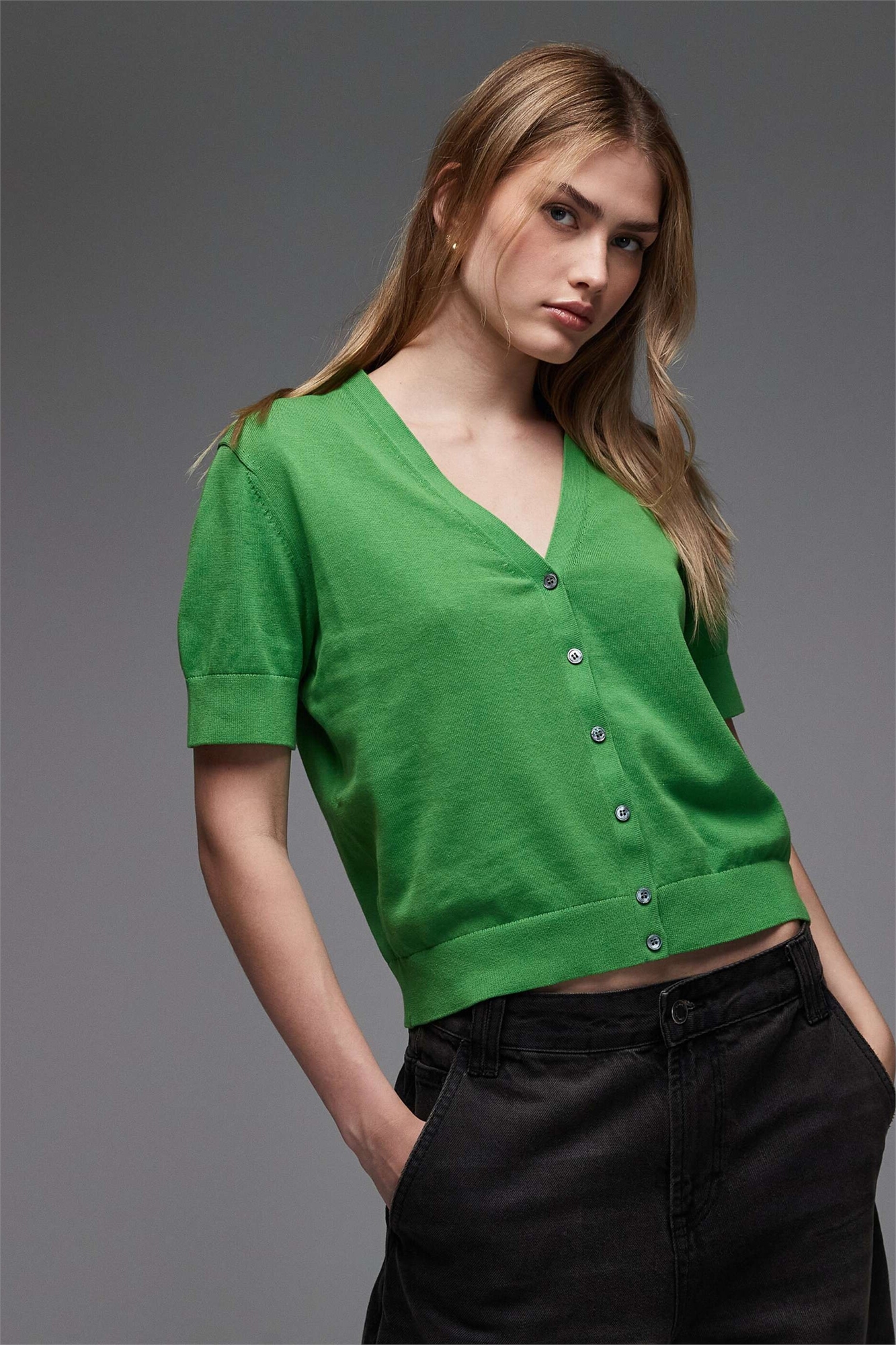Кардиган из чистого хлопка с мелким трикотажным узором и короткими рукавами
