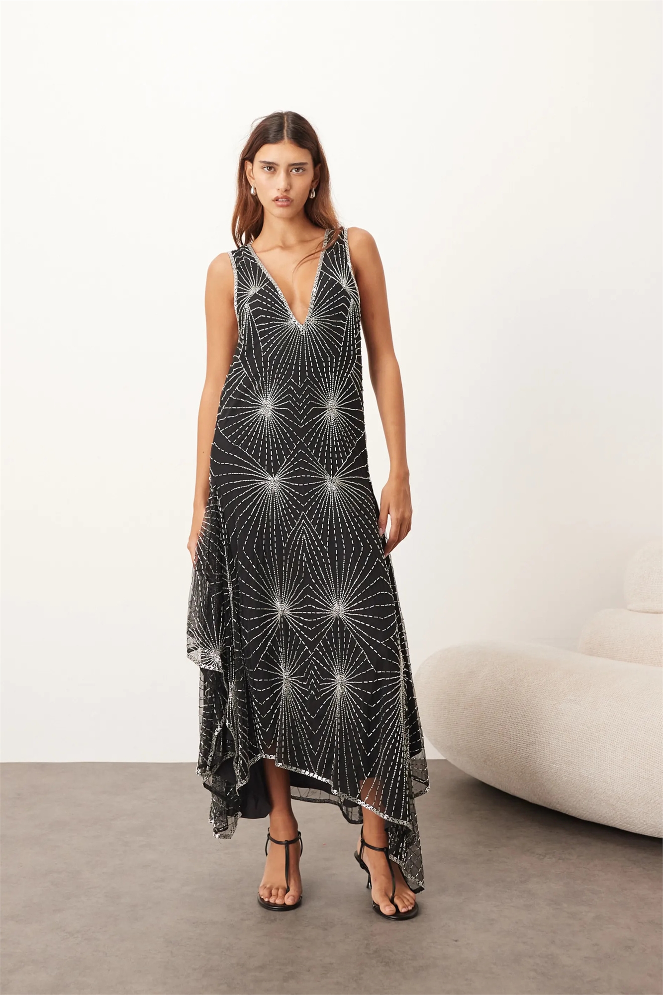 Асимметричное платье средней длины в стиле деко с линейными украшениями