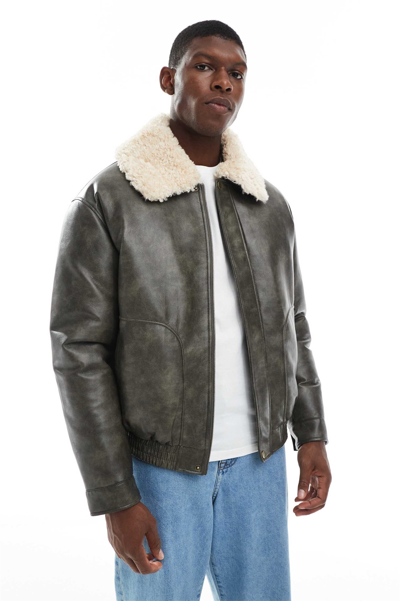 Бомбер из искусственной кожи с воротником из контрастной замши