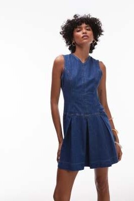 Мини-платье из денима с V-образным вырезом и складками-гофрами