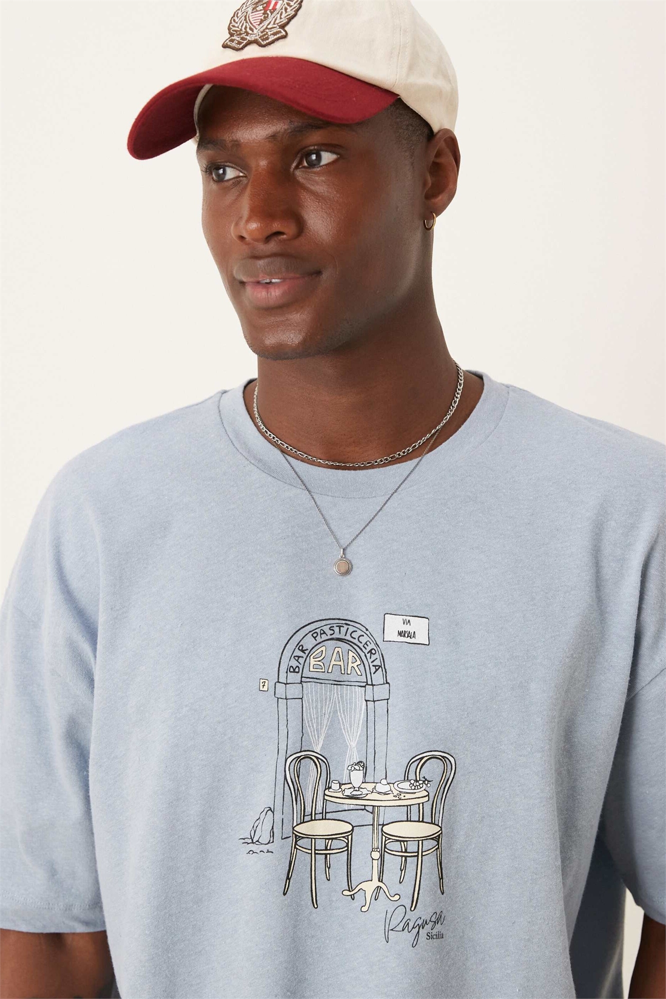 Прямая футболка свободного кроя из смешанного льна с принтом в стиле «кафе»