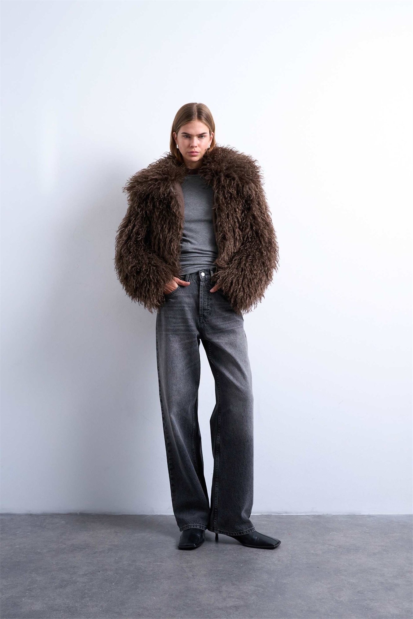 Бомбер из искусственного монгольского меха шоколадного цвета