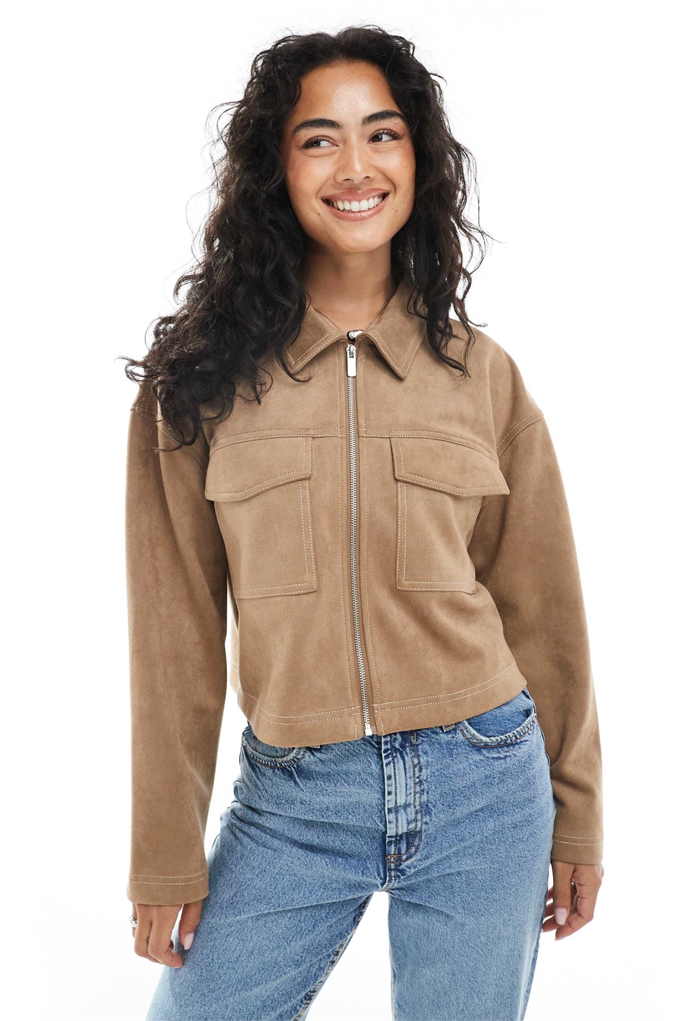 Короткая куртка из искусственной замши с контрастной строчкой, цвет серо-коричневый