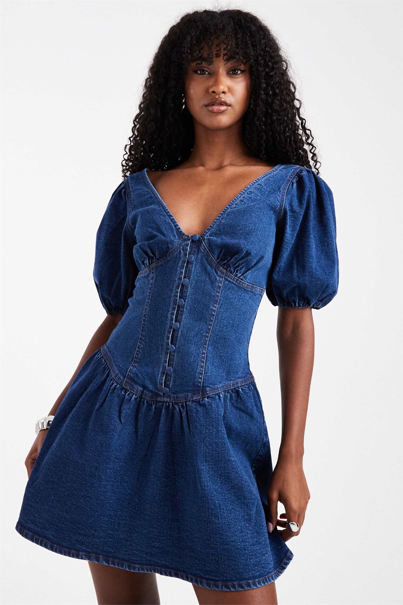 Мини-платье из денима с буфчатыми рукавами