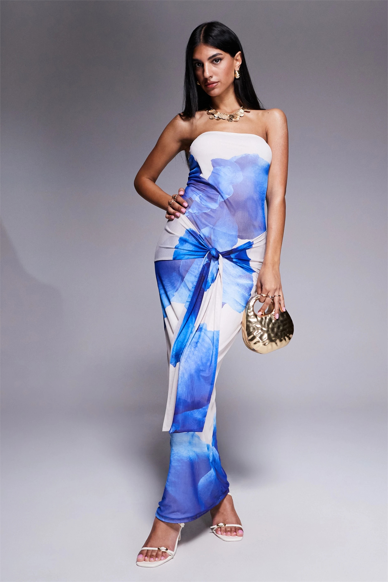 Эксклюзивное макси-платье из двухслойной эластичной сетки с цветочным принтом, завязкой на талии и драпировкой