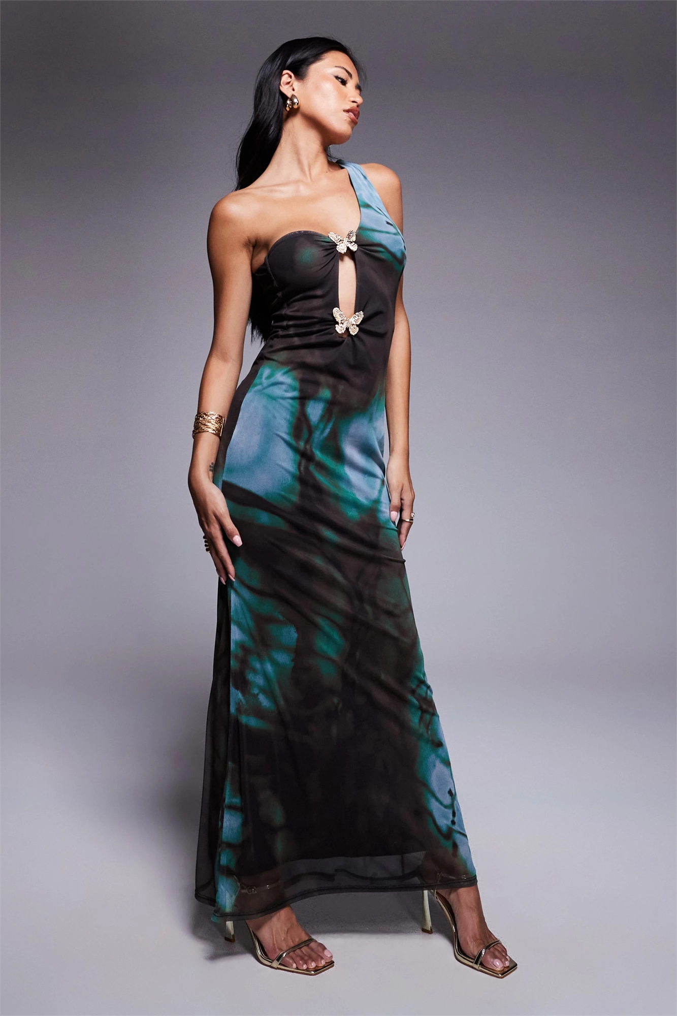 Сетчатое асимметричное платье средней длины на одно плечо с бахромой в виде бабочек