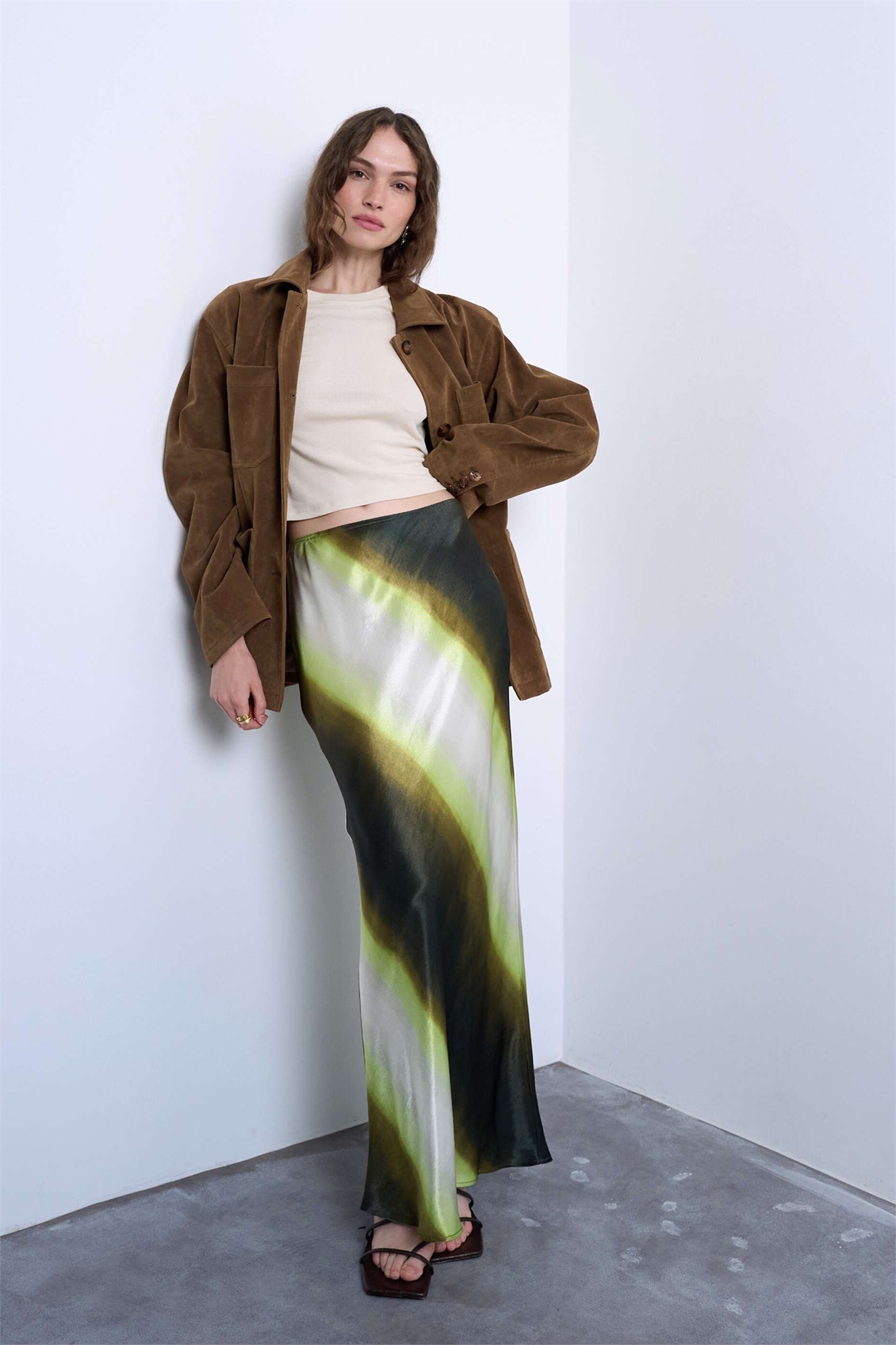 Макси-юбка из атласа с косой отрезкой