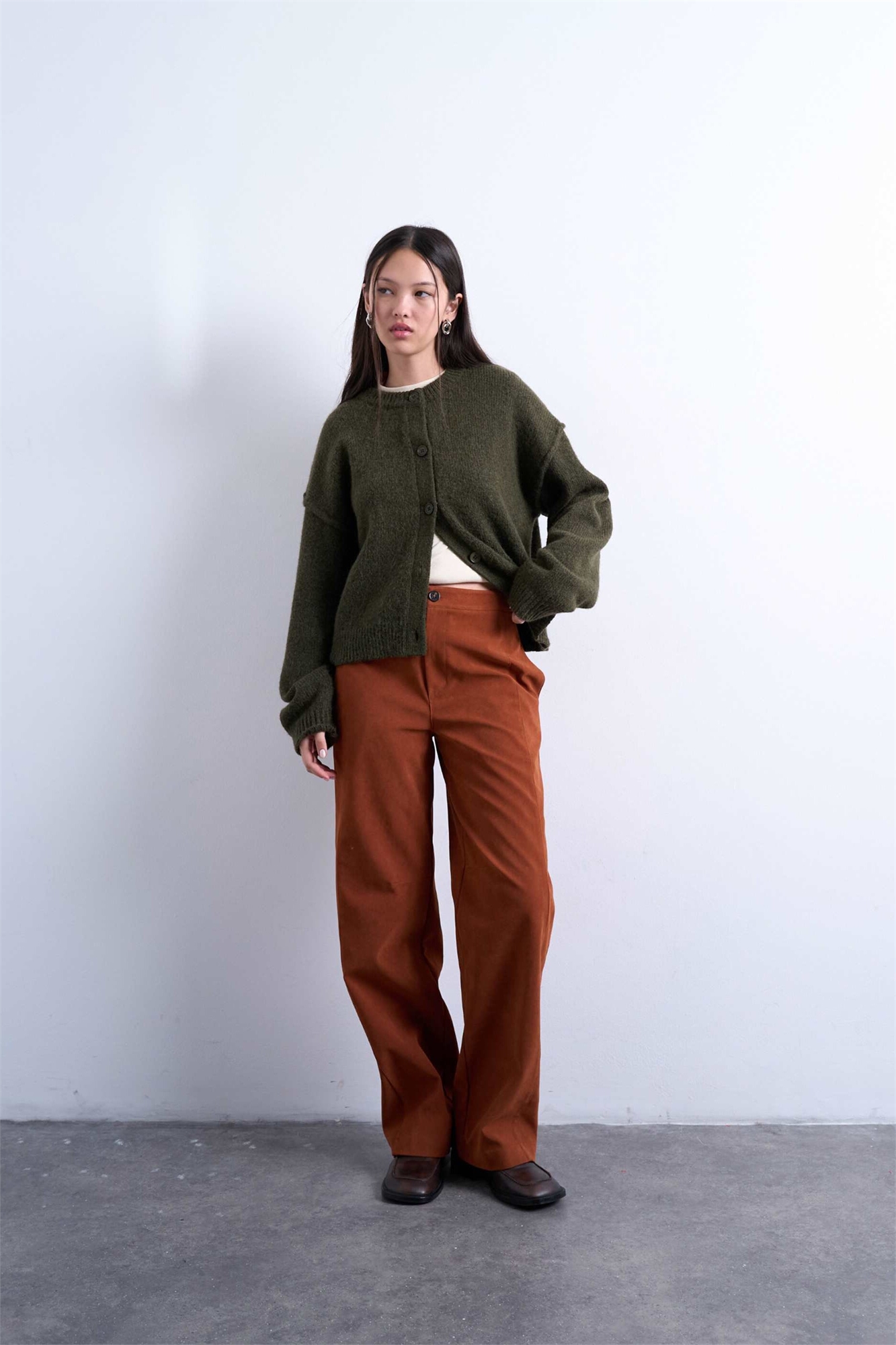 Брюки из искусственной замши с широкими брючинами и декоративными швами