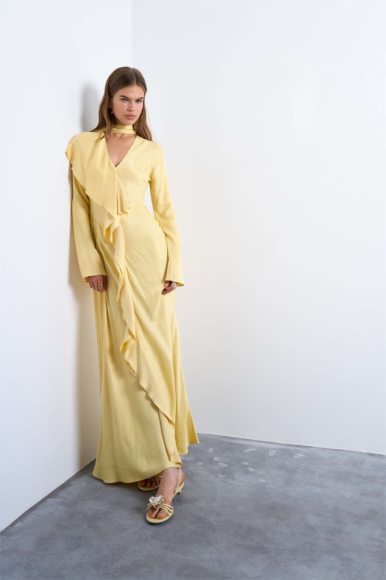 Макси-платье с длинными рукавами, оборками и элементом в виде шарфа
