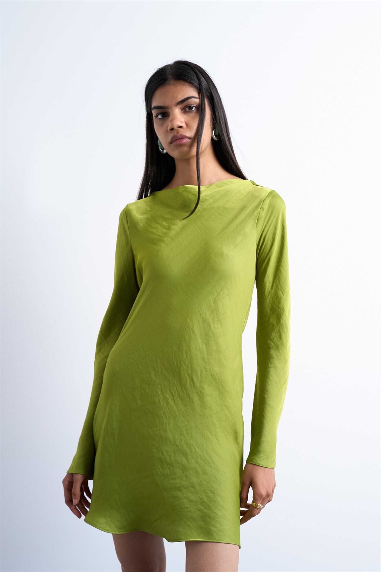 Мини-платье с капюшоном и длинными рукавами из атласа