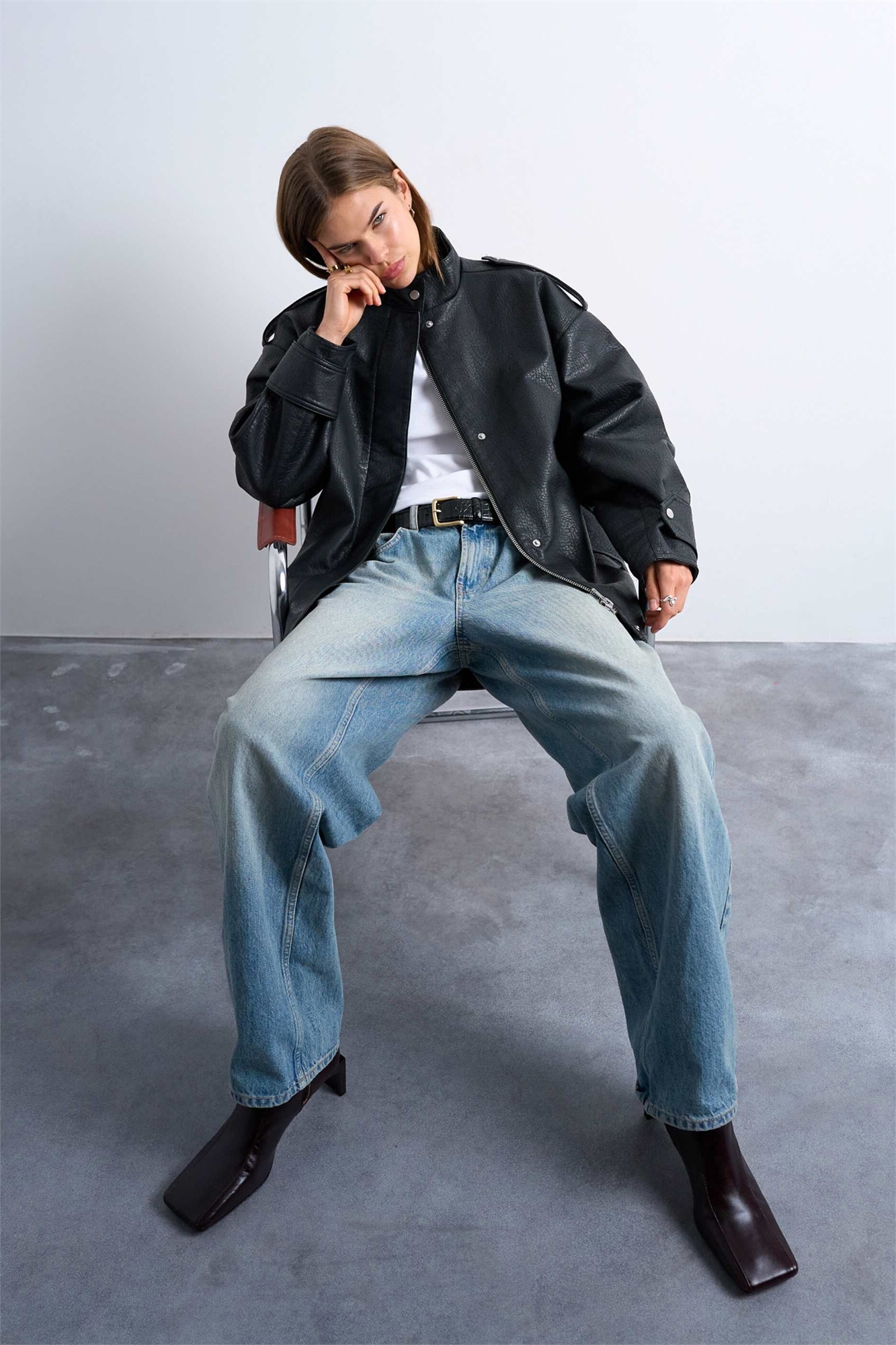 Короткая бомбер-куртка с воротником-воронкой из искусственной кожи под «пузырьковую» текстуру и ремнем