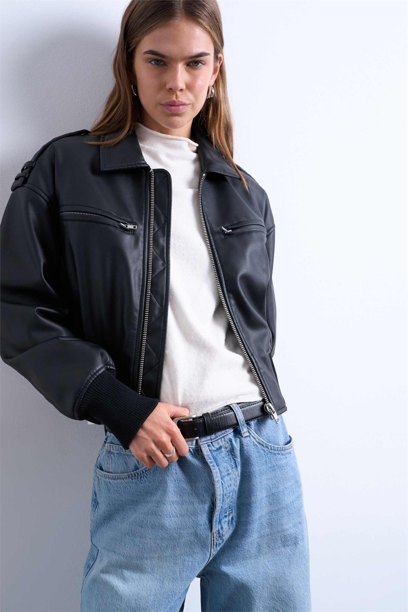 Бомбер с рукавами овальной формы из искусственной кожи