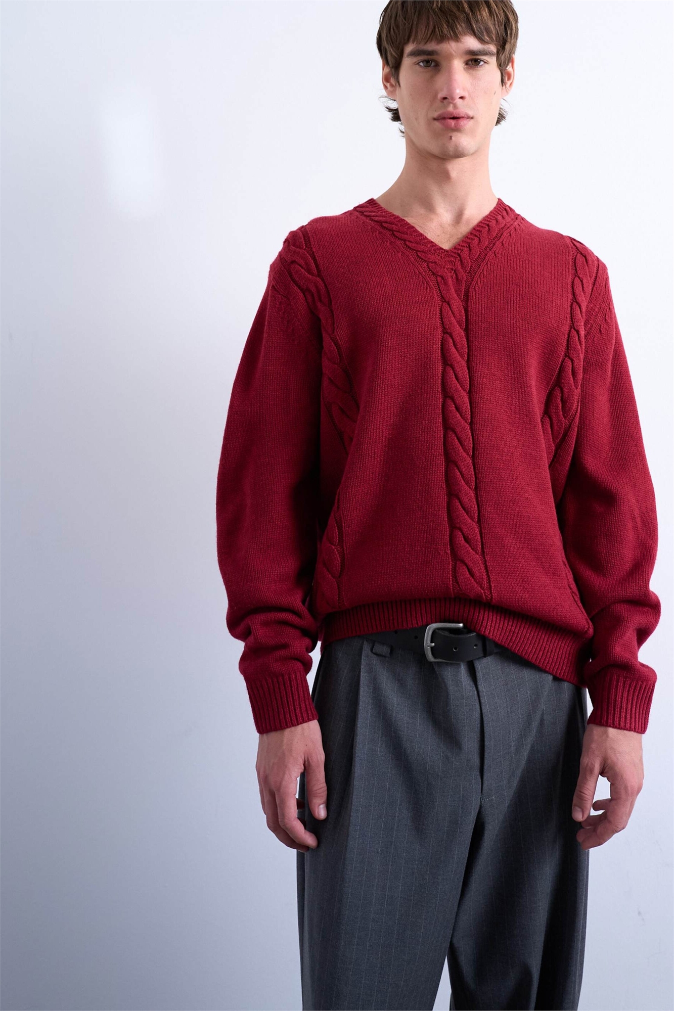 Свитер с V-образным вырезом и косами свободного кроя