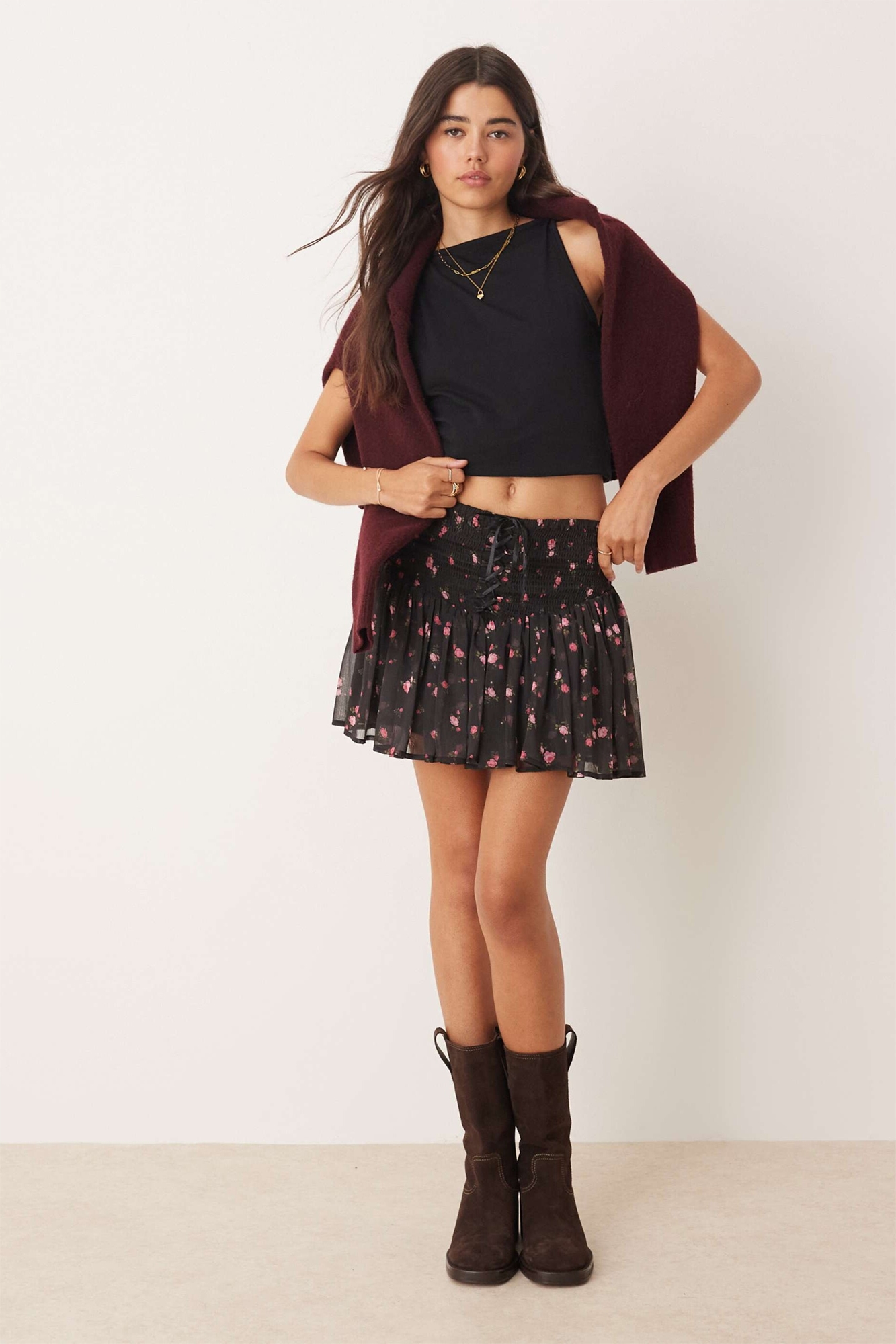 Мини-юбка с цветочным принтом и сборками на талии