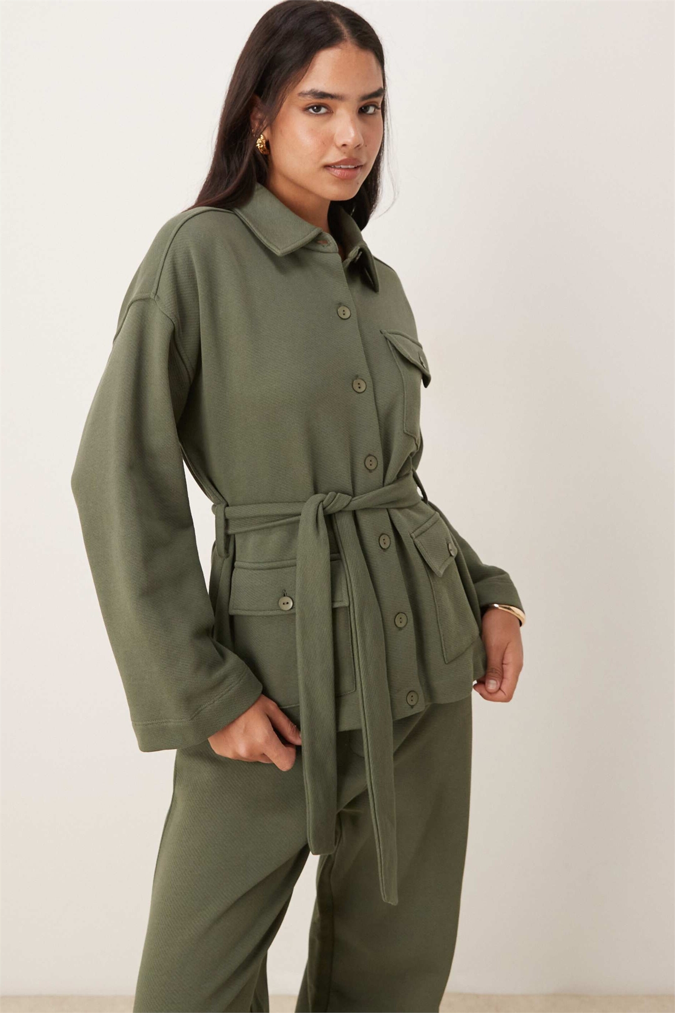 Длинный рукав из твила с завязкой спереди и пуговицами, цвет хаки