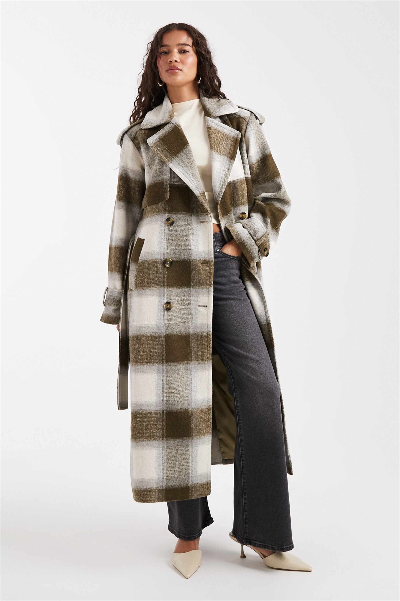 Эксклюзивный длинный тренч с поясом из шерсти зеленого и кремового цветов в клетку