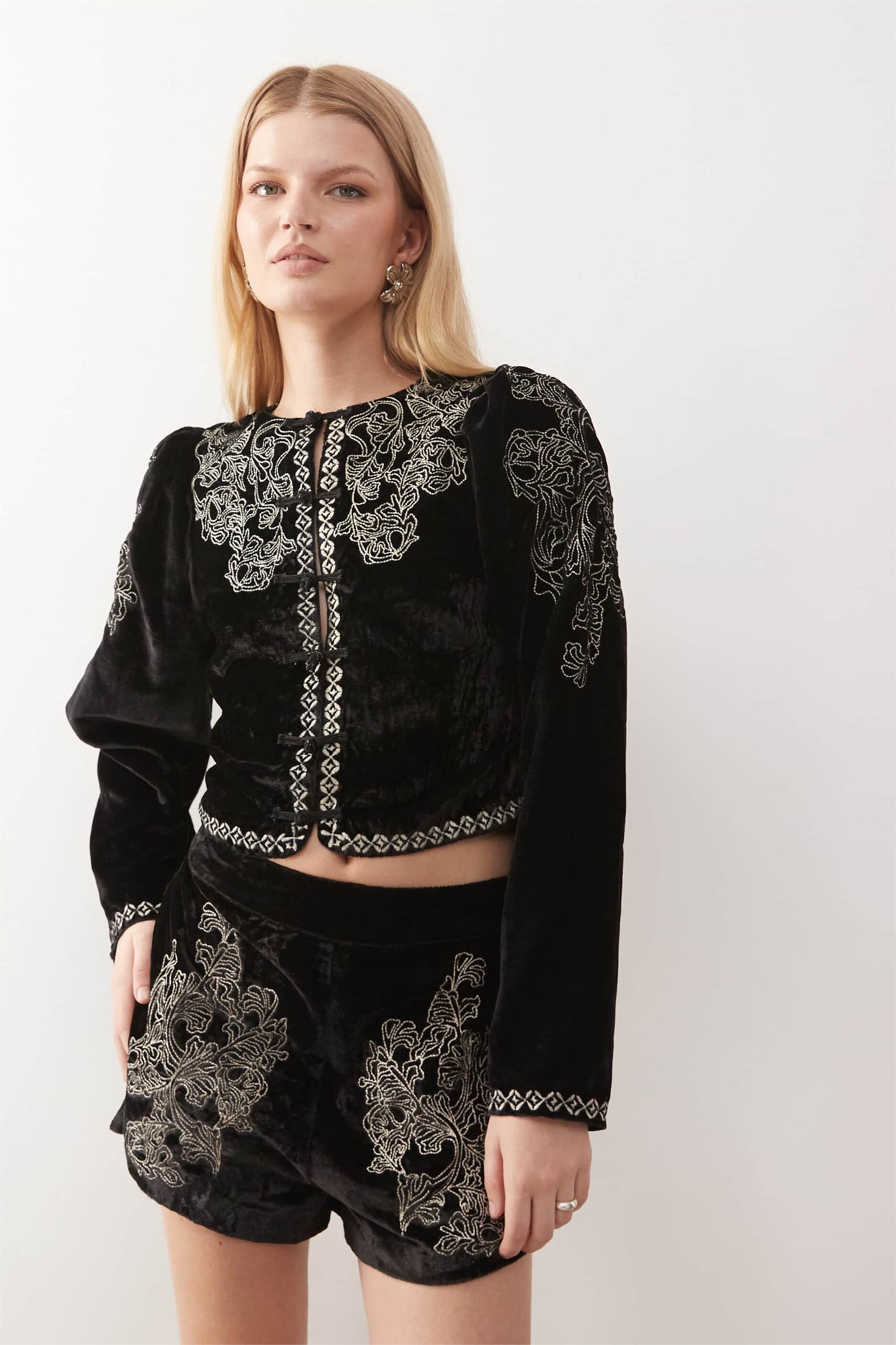 Бархатный пиджак с вышитыми рукавами-буфетками
