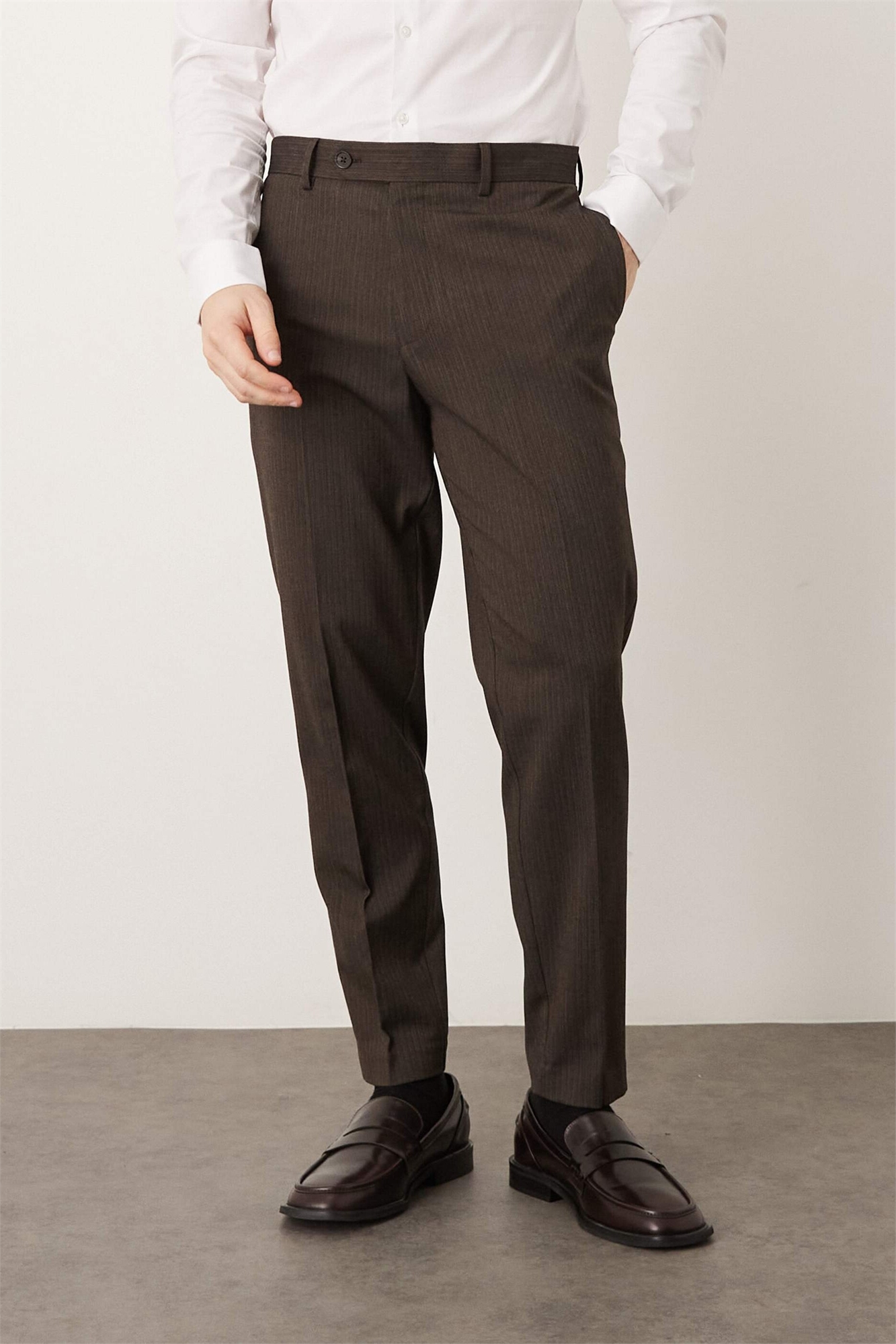 Стильные брюки зауженного кроя с коричневой полоской