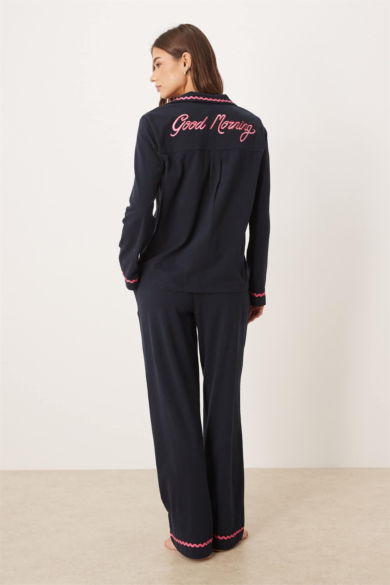 Длинный пижамный комплект на пуговицах с вышивкой «Доброе утро» и волнистой отделкой