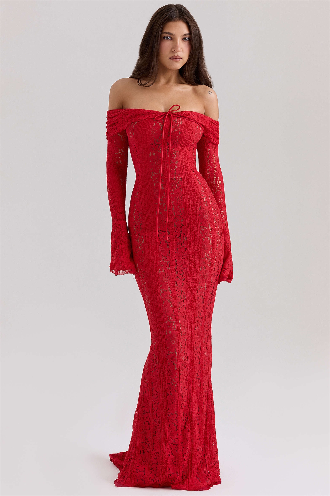 Макси-платье Belle с открытыми плечами из кружева с цветочным принтом