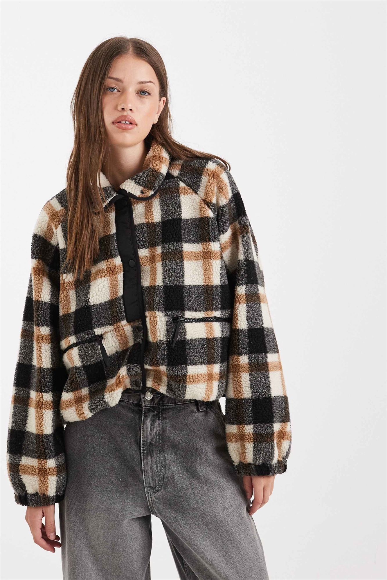 Детали воротника куртки с борговым узором в бежевую клетку