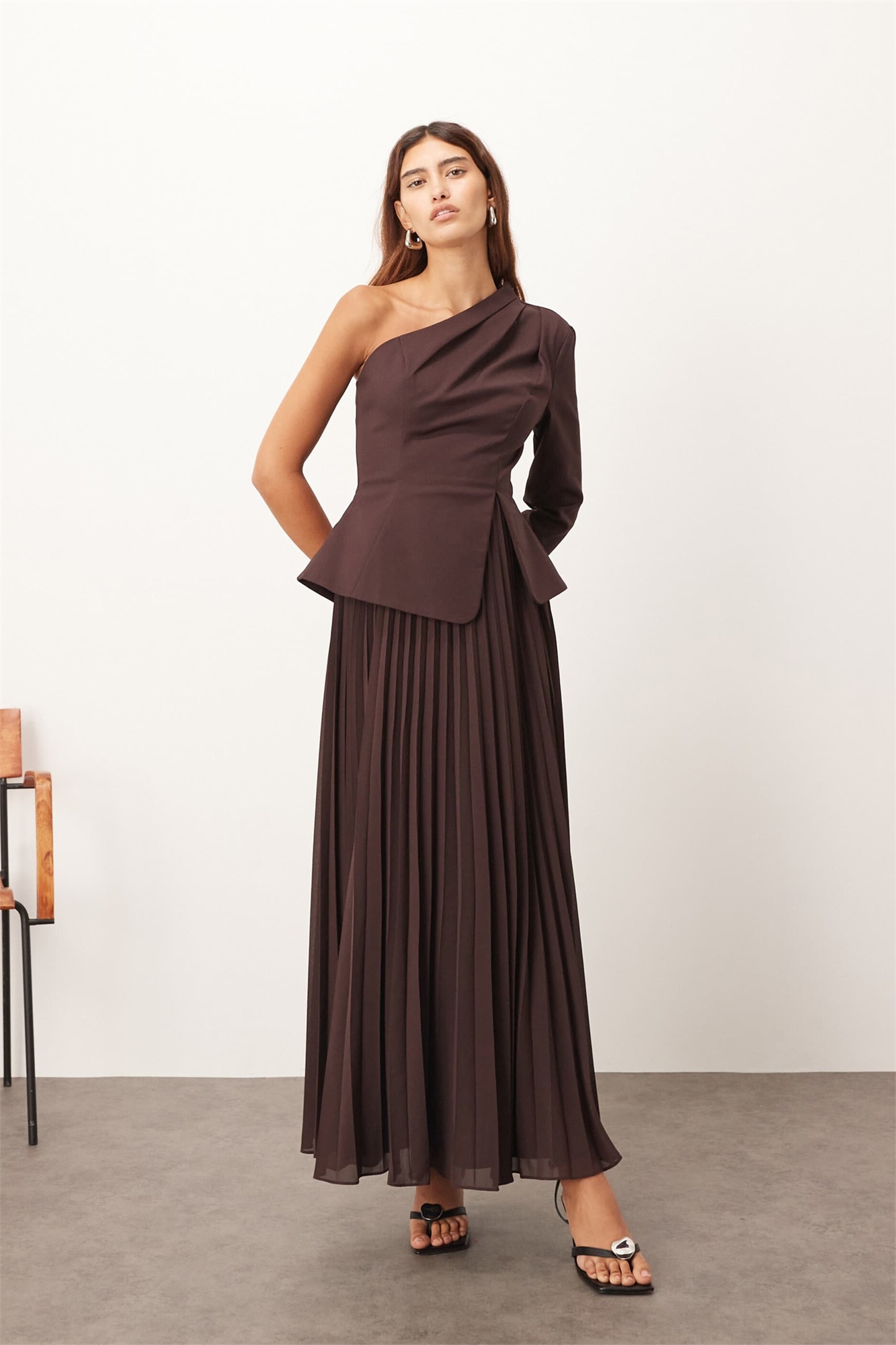 Макси-платье с асимметричным вырезом на одном плече и подолом с мелкими складками