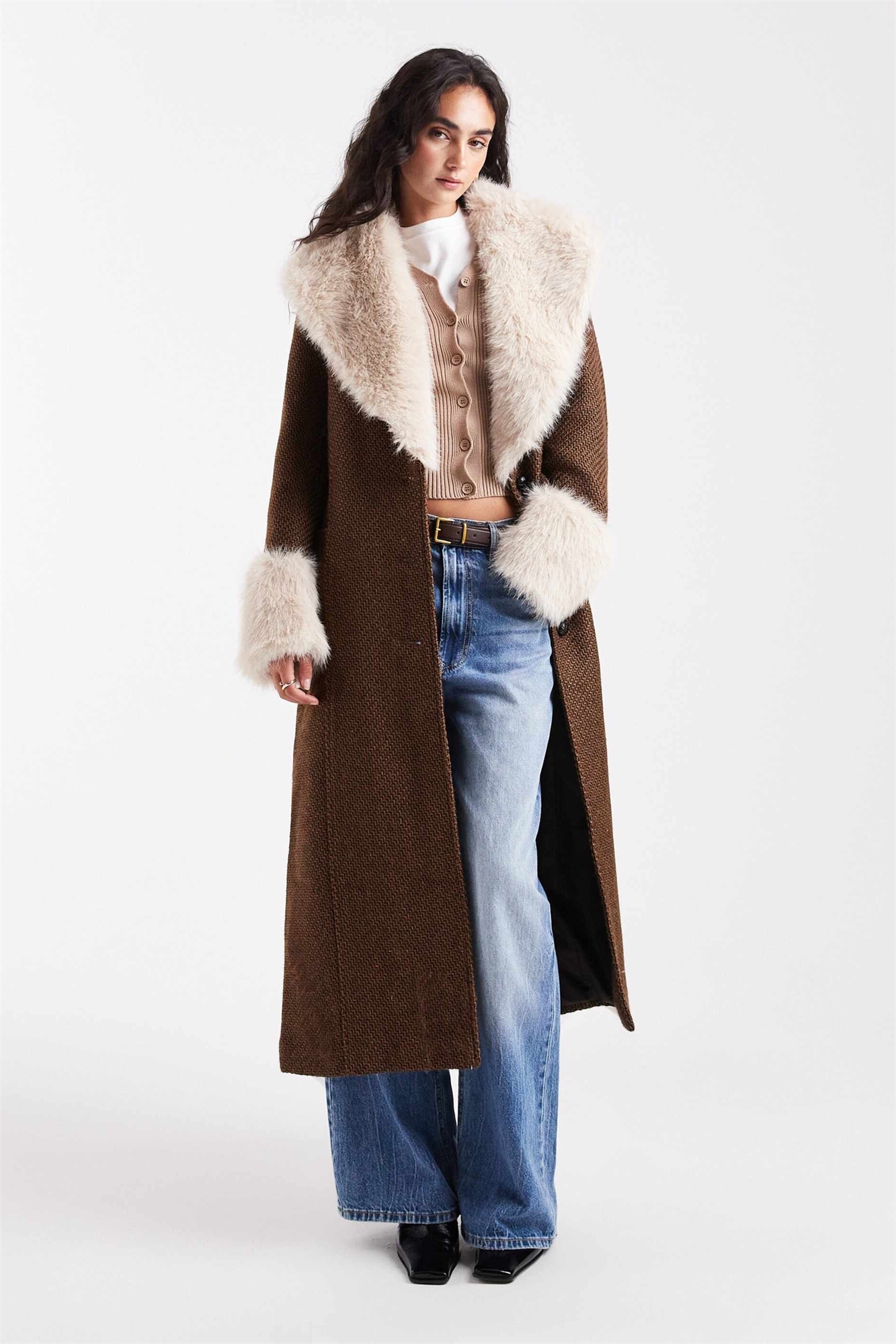 Текстурированное пальто-лонглайн в стиле «Пенни-лейн» с отделкой из искусственного меха