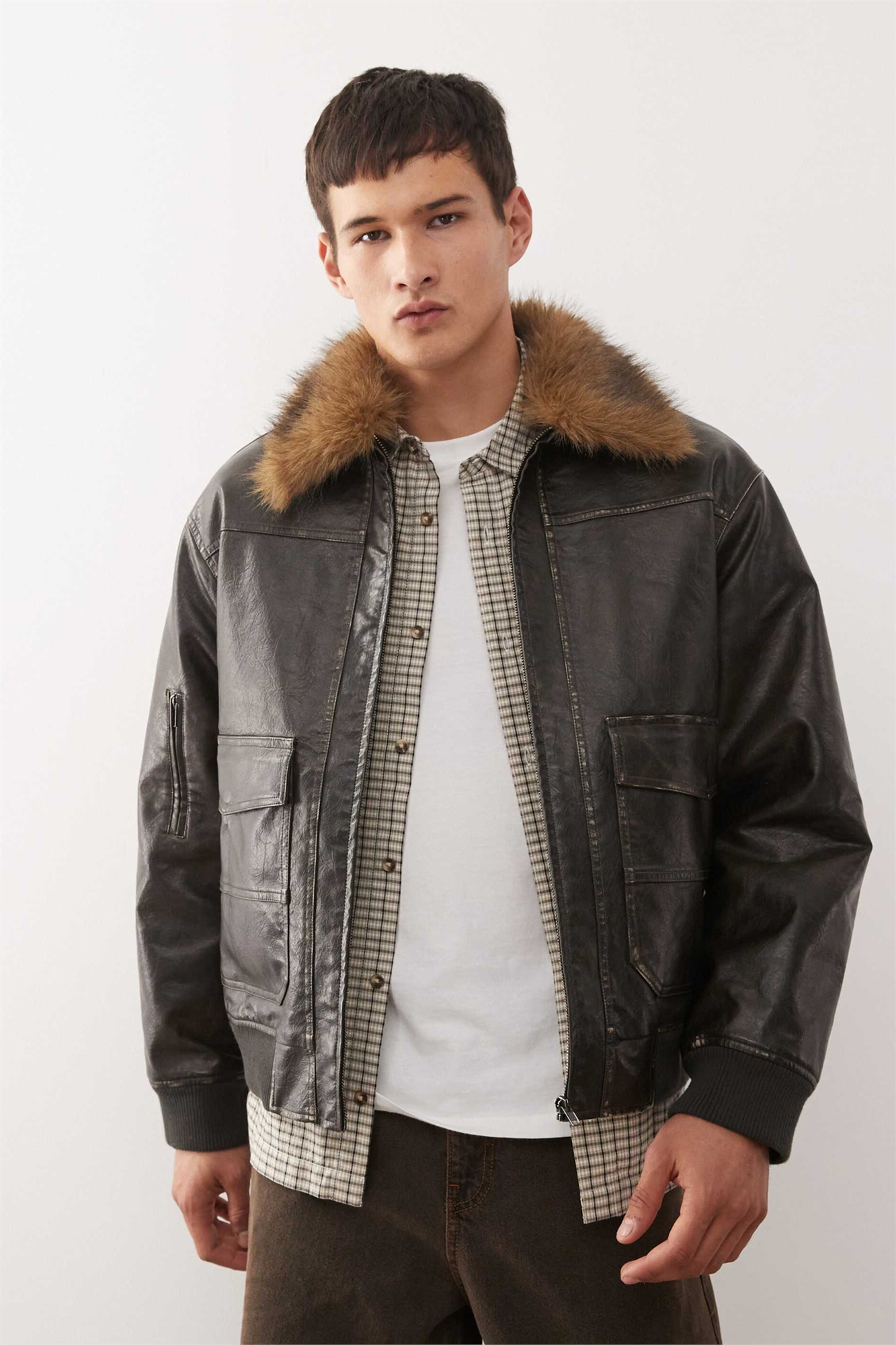 Куртка-бомбер под кожу с воротником из искусственного меха