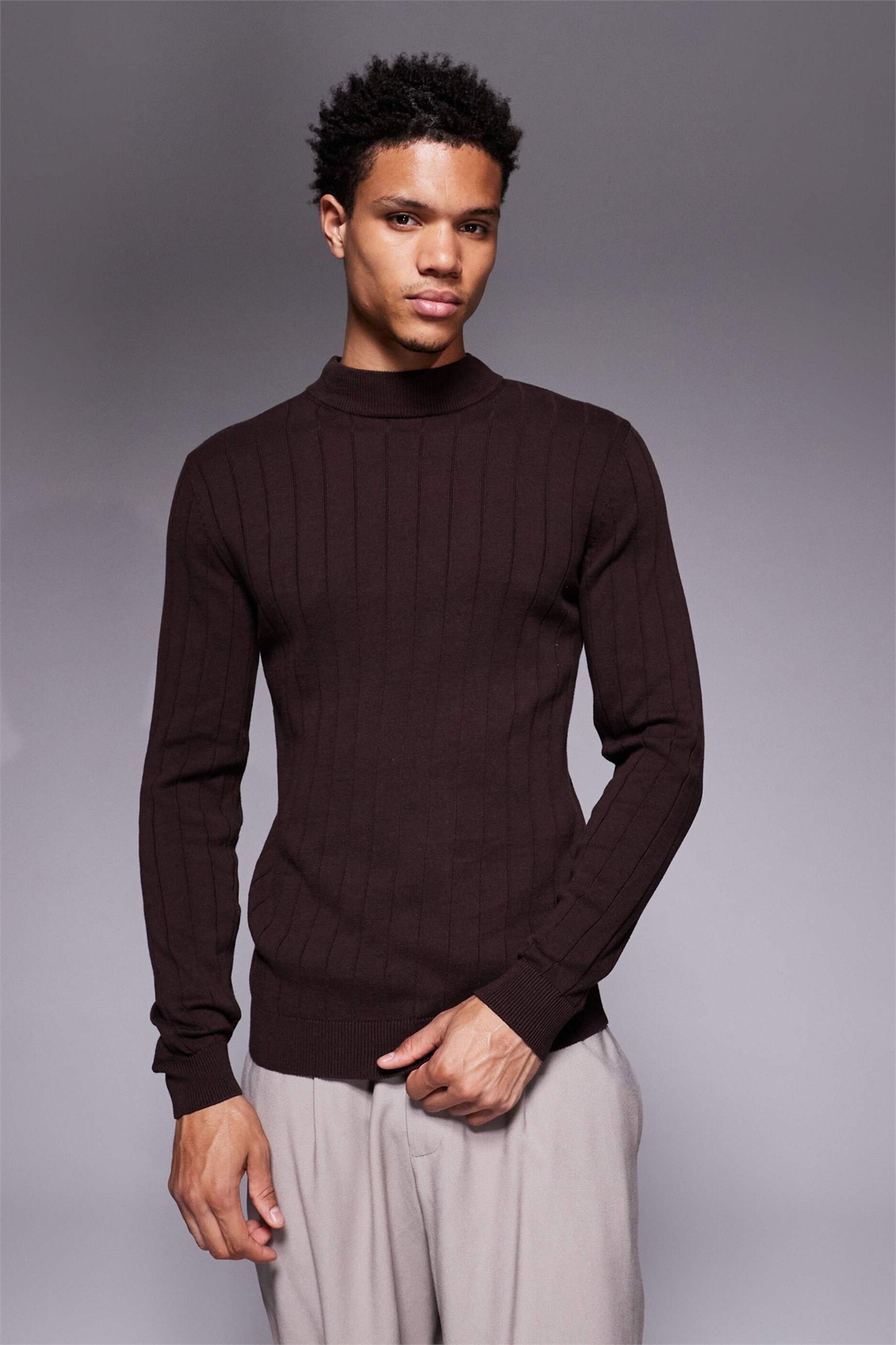 Футболка с длинным рукавом из трикотажа с ребристой фактурой и высоким воротником