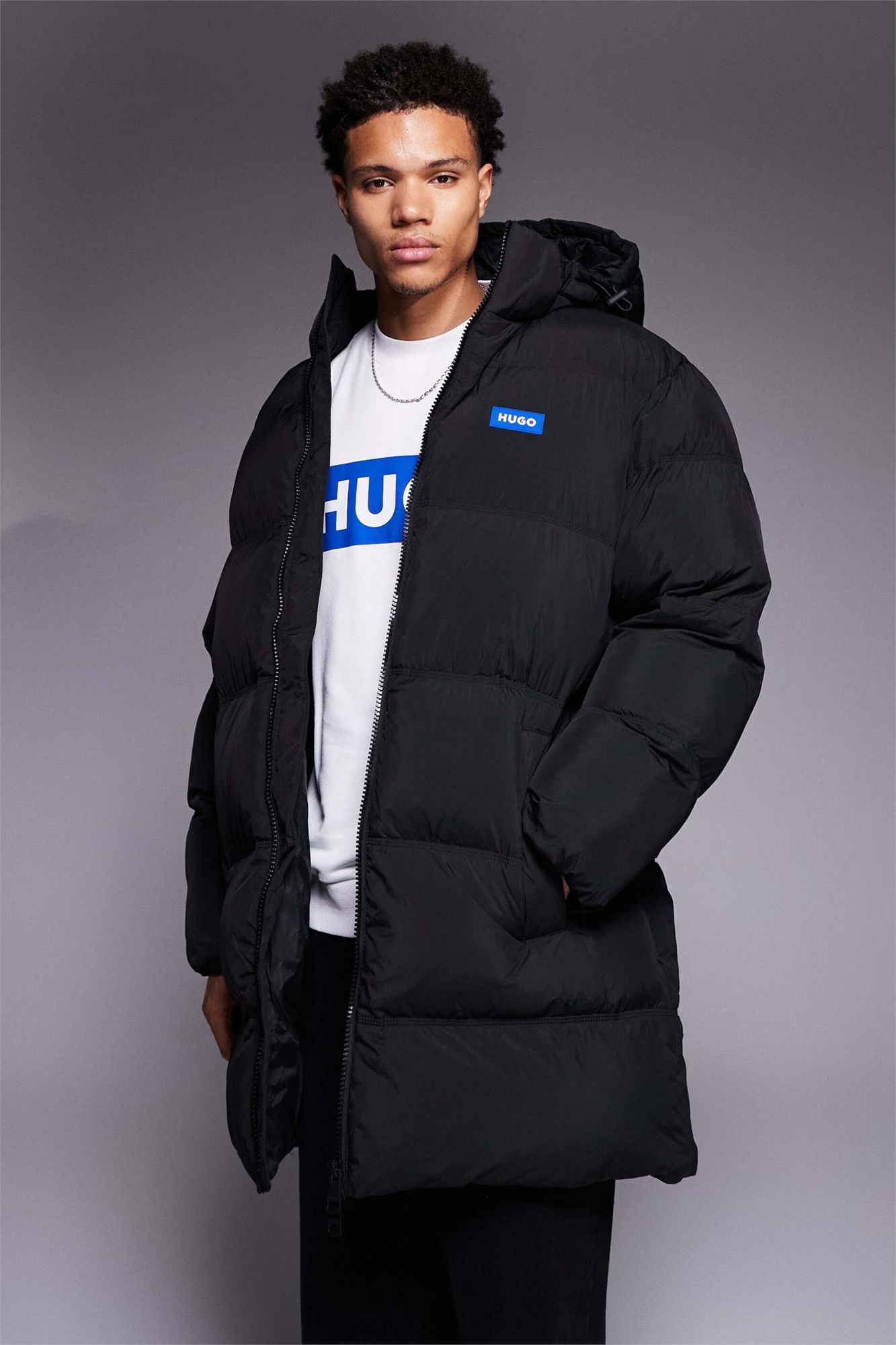 Пуховик свободного кроя с удлиненным силуэтом и крупными стегаными блоками