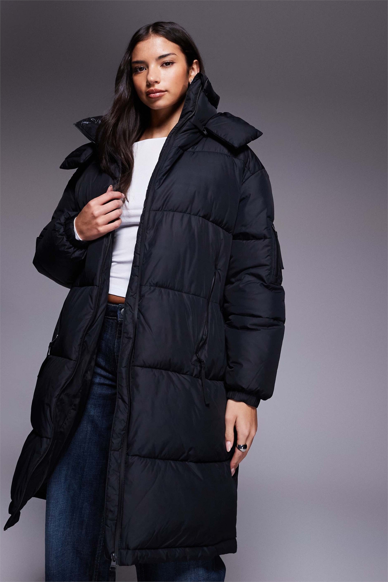 Пуховик с капюшоном и длинным покроем от Faridali