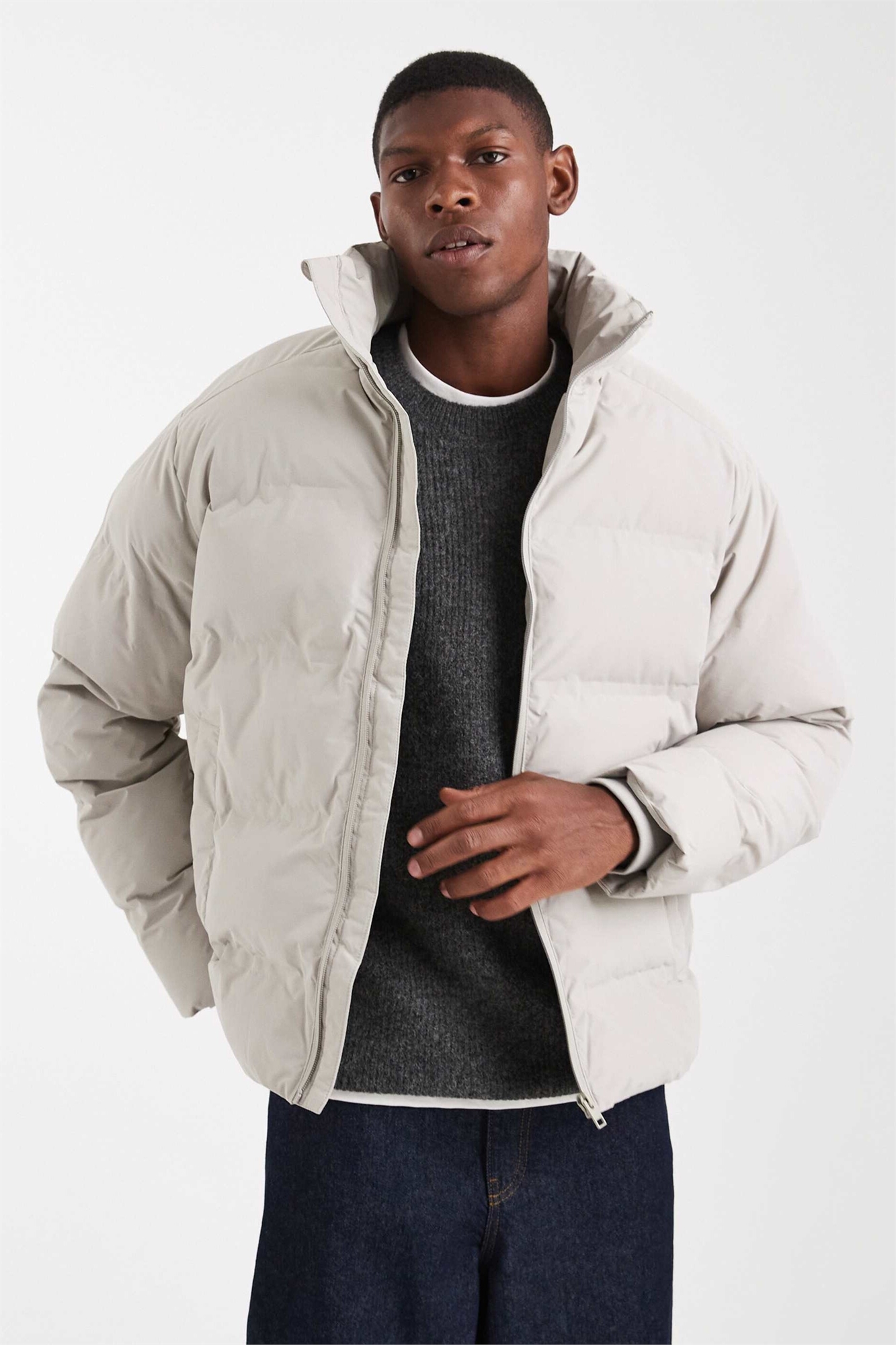 Толстая пуховая куртка светло-серого цвета