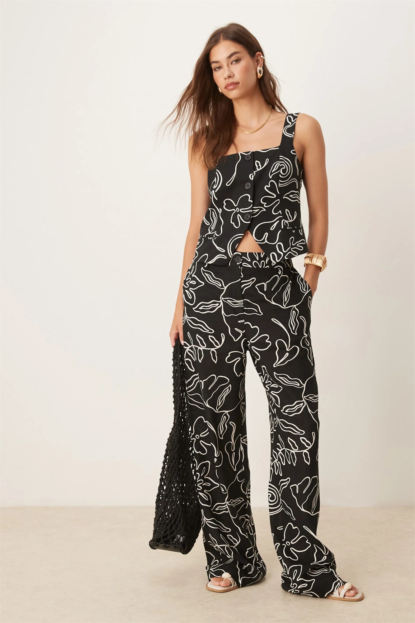 Брюки из смешанного льна с монохромным принтом в виде эскизов co-ord