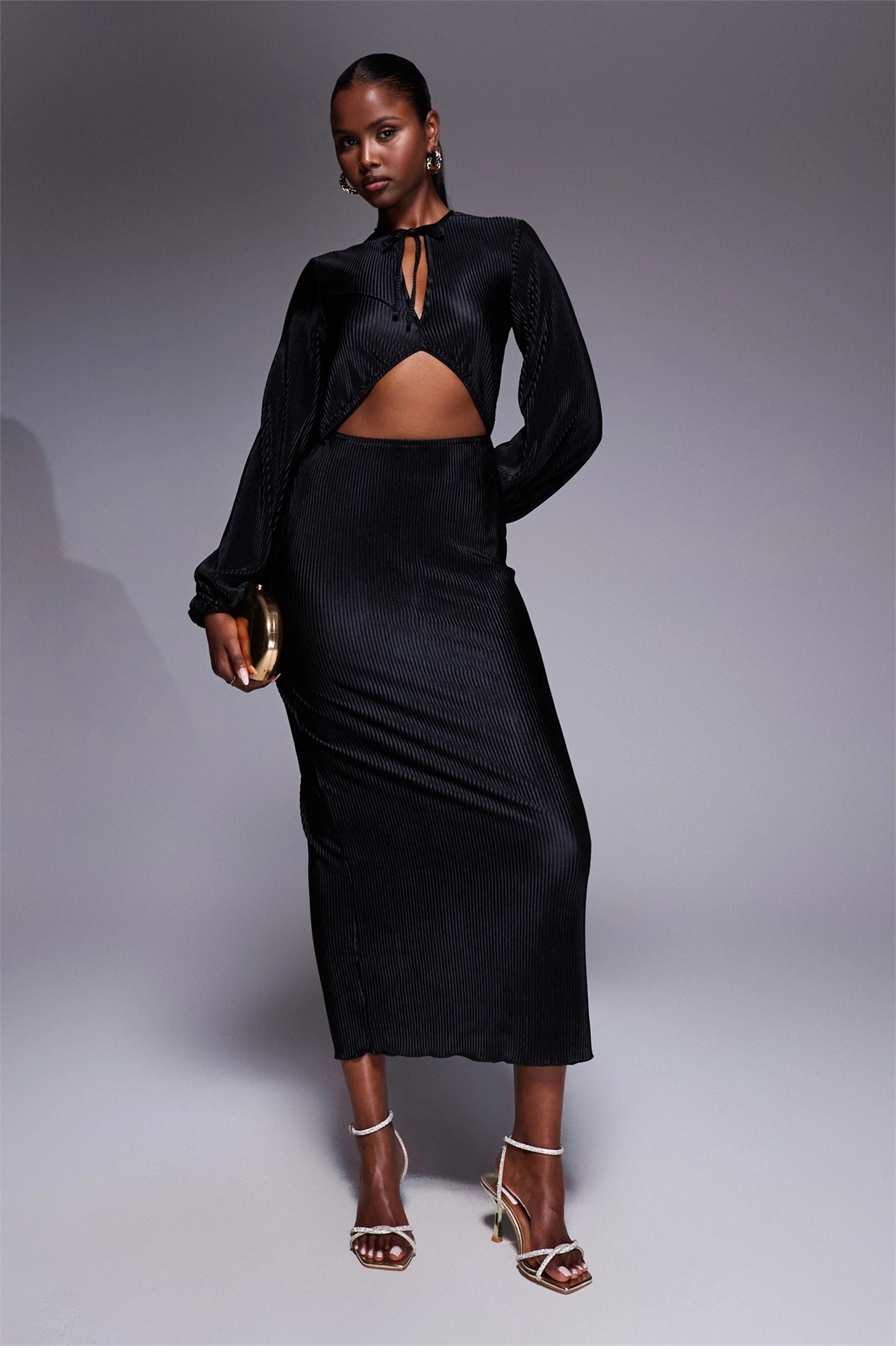 Плиссированное платье средней длины с вырезом и бантиком спереди