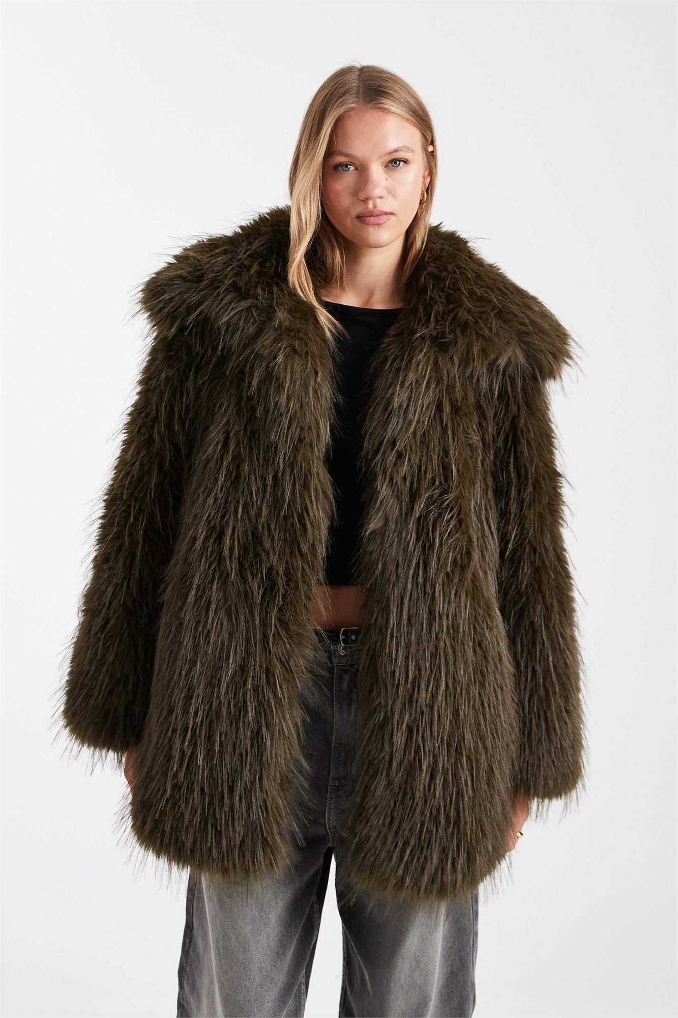 Искусственная меховая шуба оливкового цвета