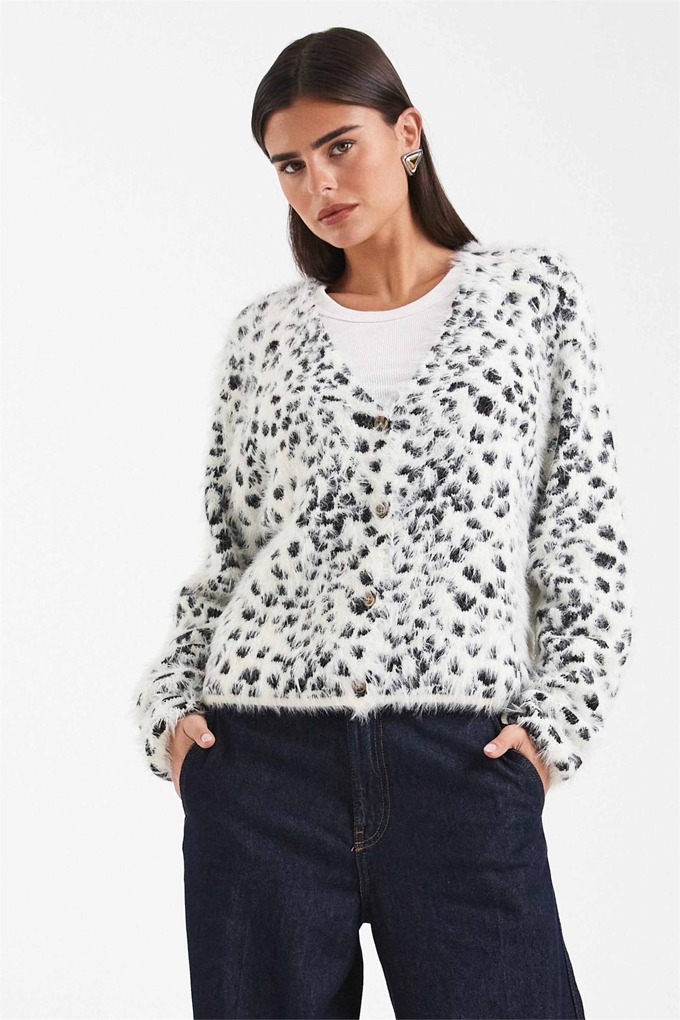 Пушистый вязаный кардиган с рисунком снежного барса
