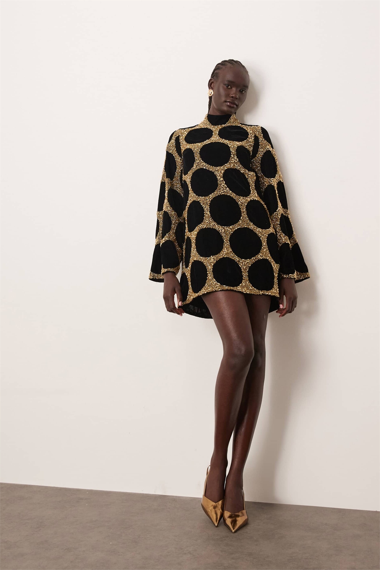 Мини-платье с высоким воротником, длинными рукавами и декоративными вставками