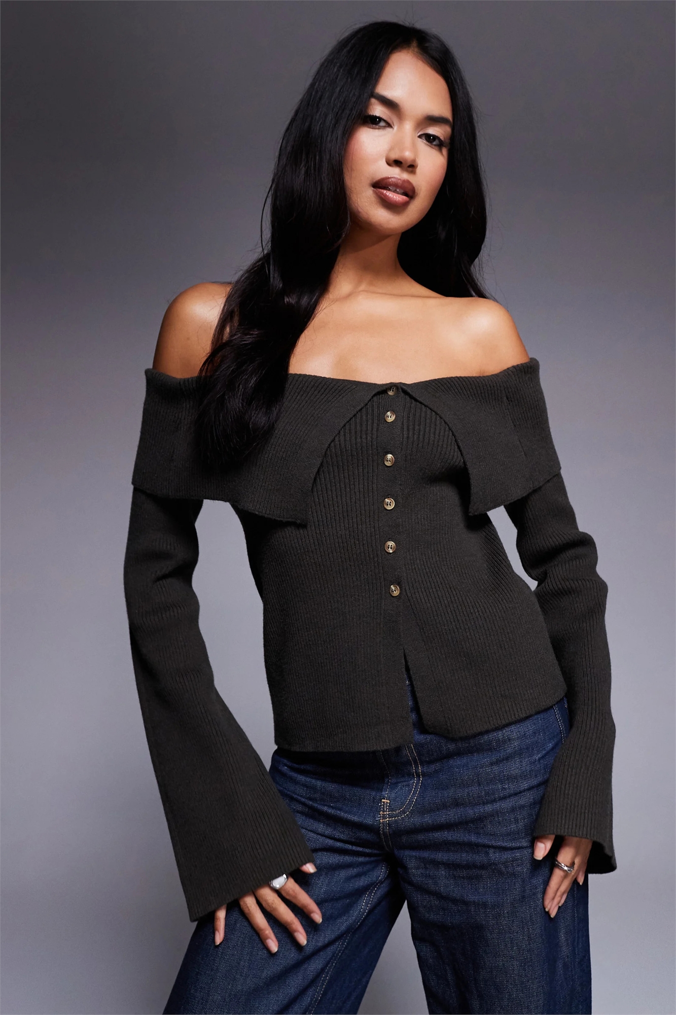 Эксклюзивный вязаный джемпер с ребристой отделкой, отложным воротником-бардо, пуговицами и расклешенными рукавами