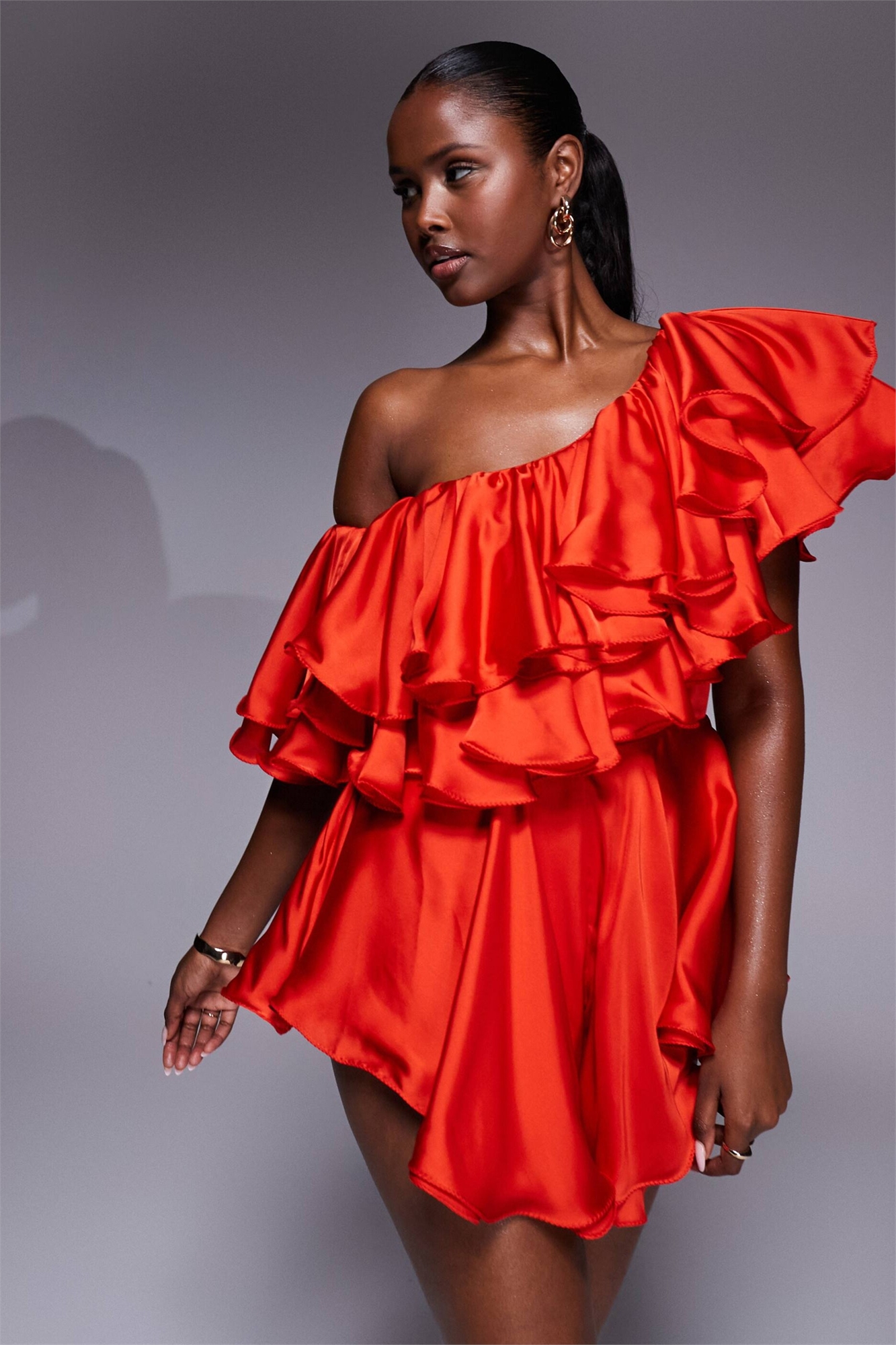 Асимметричный атласный комбинезон с рюшами «Liliana»