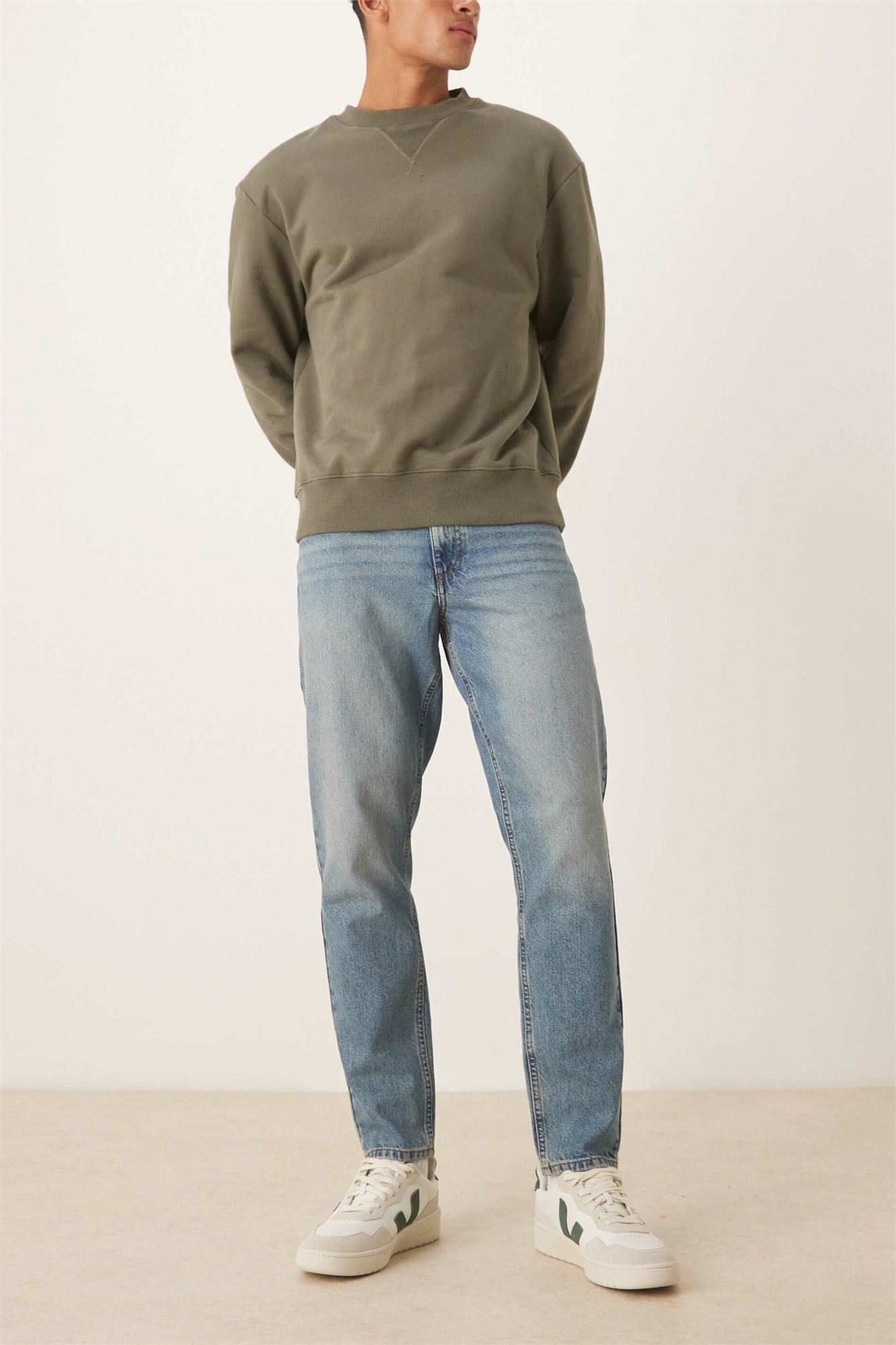 Неэластичный деним: средне-синий оттенок Основной материал: 99% хлопок, 1% эластан.