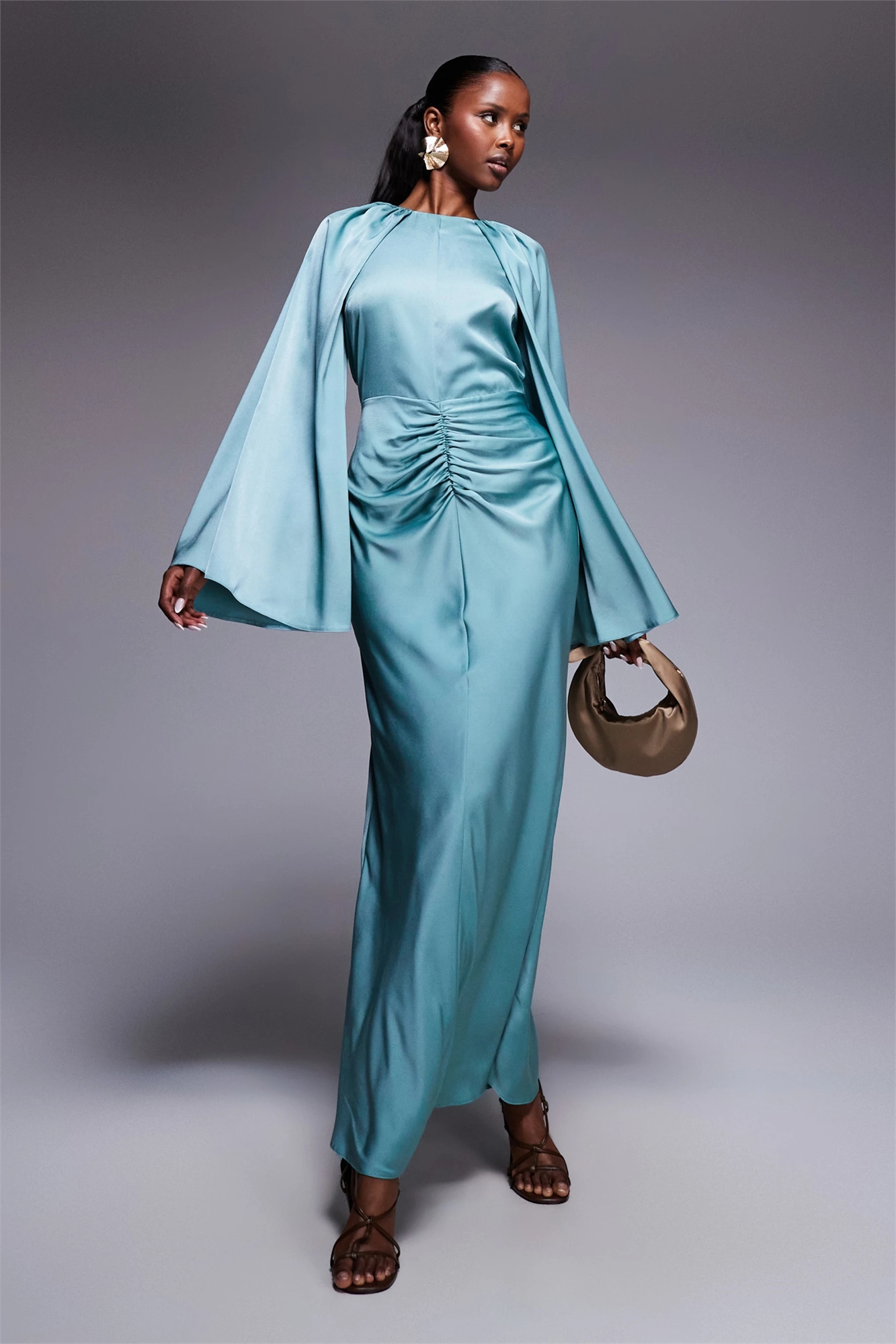Атласное макси-платье с длинными рукавами и юбкой с центральной сборкой