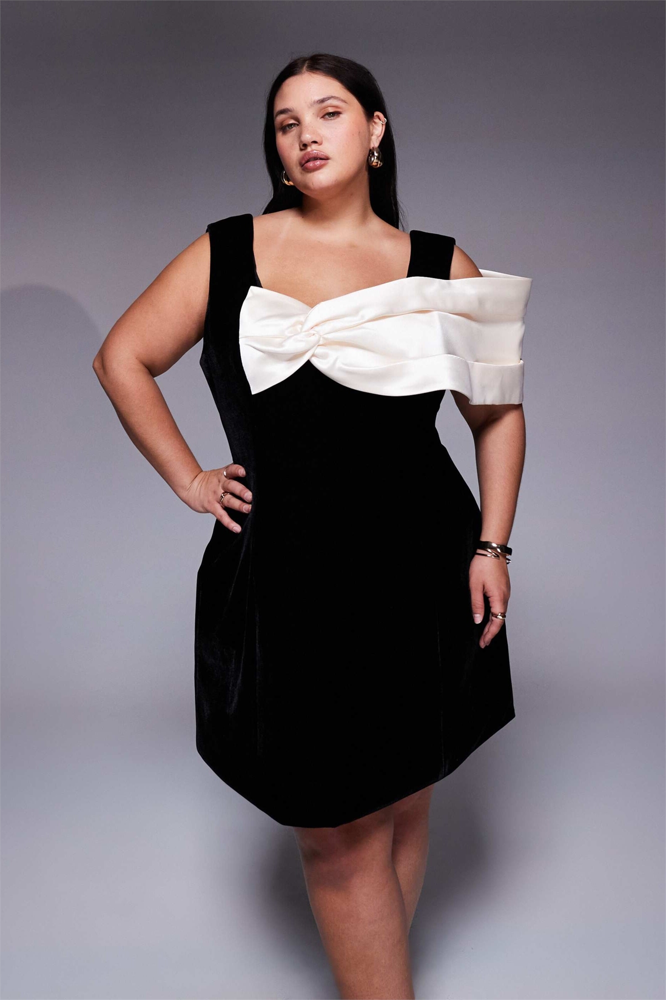 Мини-платье из бархата с выпуклой линией и драпировкой из атласа