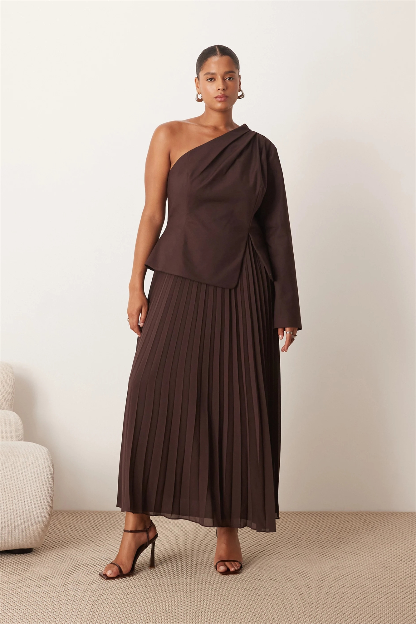 Макси-платье с асимметричным вырезом и микроплиссированным подолом
