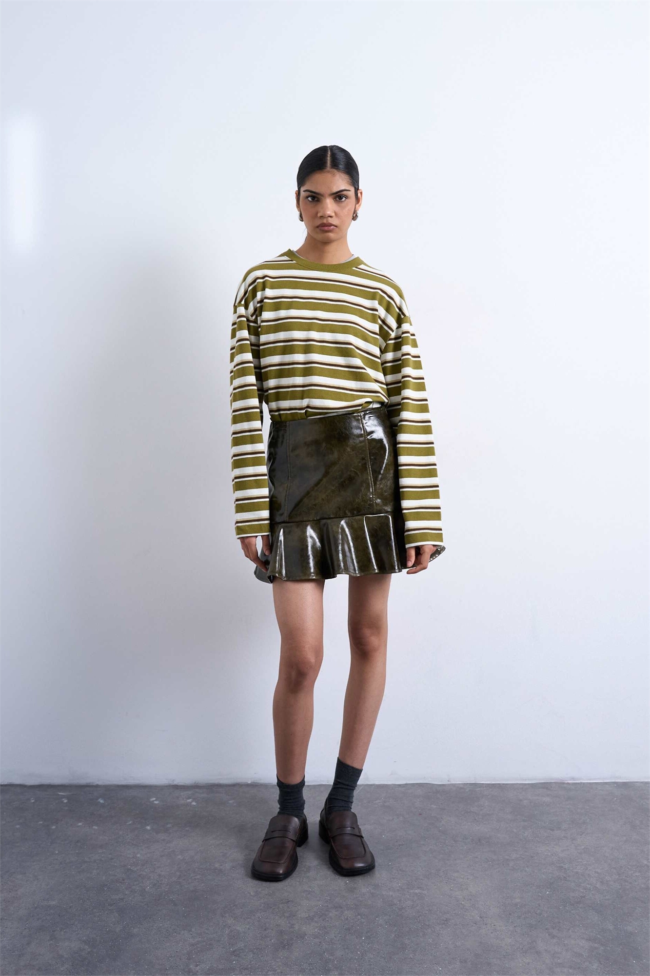 Виниловая мини-юбка с баской